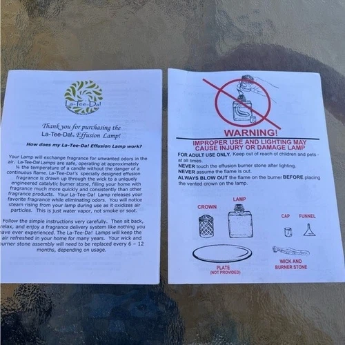 La-Tee-Da Effusion lamps exchange fragrance for unwanted odors in the air. The Lamp works at approximately ¼ the temperature of a candle. It pulls fragrance up through the wick to the burner. The burner releases the fragrance and will saturate a room more quickly and efficiently than other fragrance products. The La-Tee-Da! Lamp releases fragrance while eliminating odors without a continuous flame. There may be slight smoking while your lamp is oxidizing air particles. This is steam. New. Comes with lamp, 2 wicks & burner assembly, heavy metal crown, funnel, solid metal snuffer cap. Comes in original box but is missing some of the Styrofoam and box has some damage.