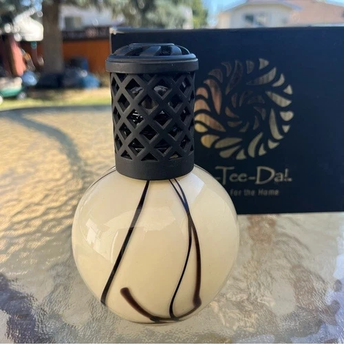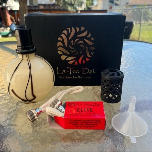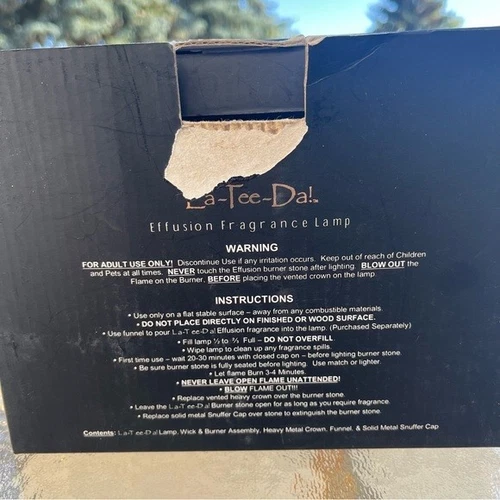 La-Tee-Da Effusion lamps exchange fragrance for unwanted odors in the air. The Lamp works at approximately ¼ the temperature of a candle. It pulls fragrance up through the wick to the burner. The burner releases the fragrance and will saturate a room more quickly and efficiently than other fragrance products. The La-Tee-Da! Lamp releases fragrance while eliminating odors without a continuous flame. There may be slight smoking while your lamp is oxidizing air particles. This is steam. New. Comes with lamp, 2 wicks & burner assembly, heavy metal crown, funnel, solid metal snuffer cap. Comes in original box but is missing some of the Styrofoam and box has some damage.