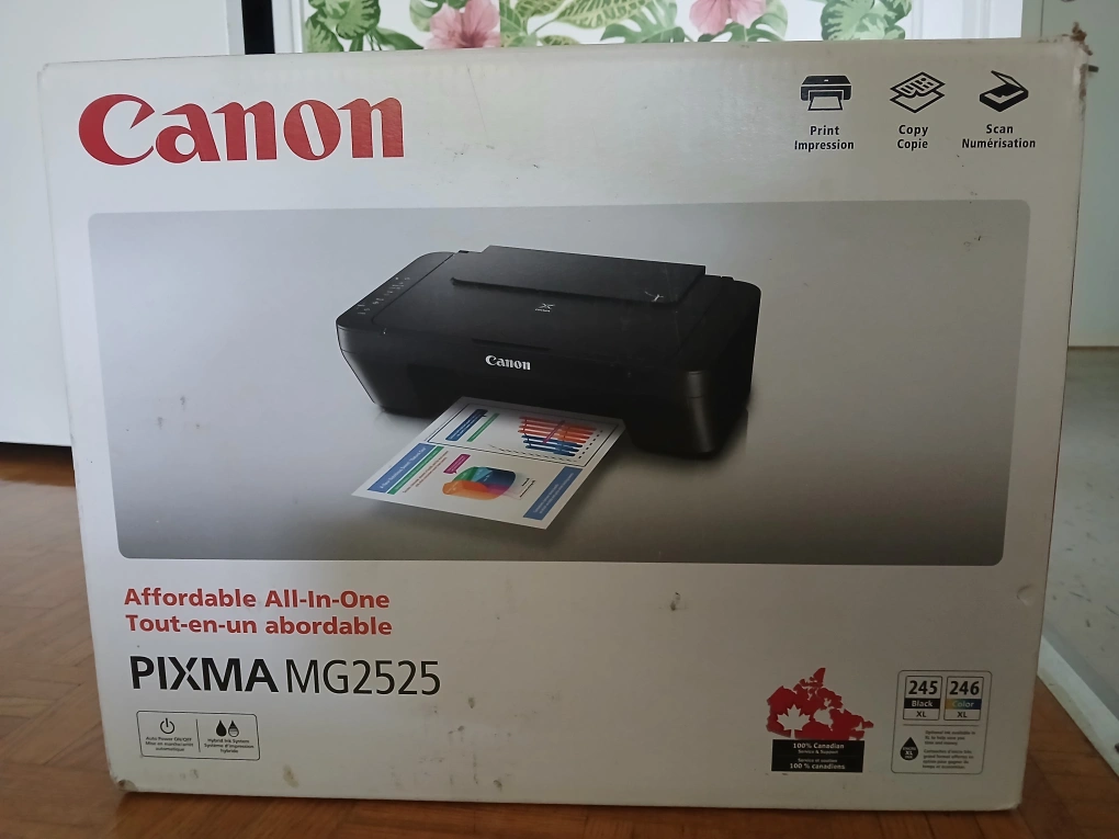 Canon PIXMA MG2525 All-in-One printer, print, copy, scan. Includes ink cartridges. The box is light and can be carried easily.