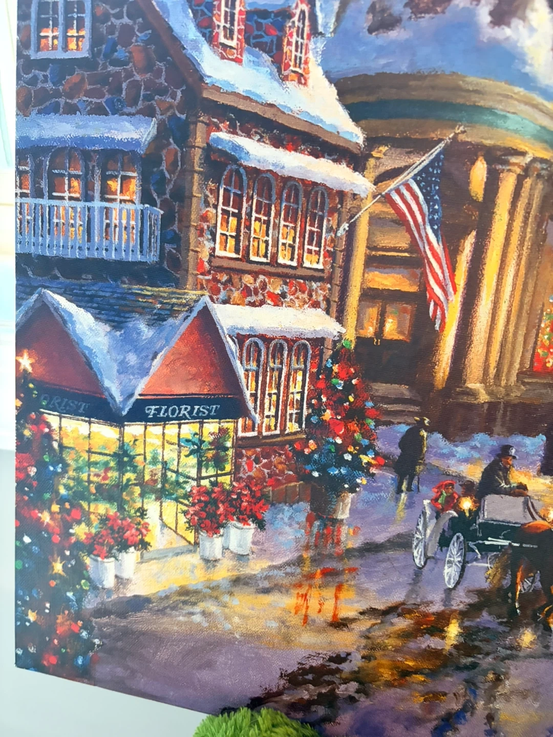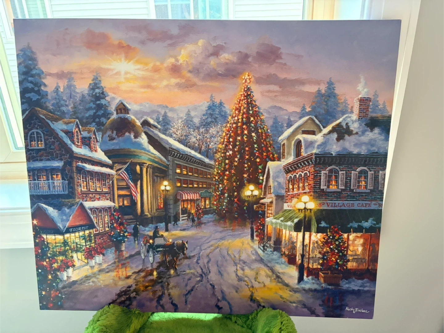 This beautiful wall art depicts a charming winter village scene with a large decorated Christmas tree in the center. Snow-covered buildings like a florist and a cafe line the street, illuminated by warm lights. A horse-drawn carriage adds a festive touch to the snowy evening. It's perfect for adding a cozy holiday atmosphere to your home!