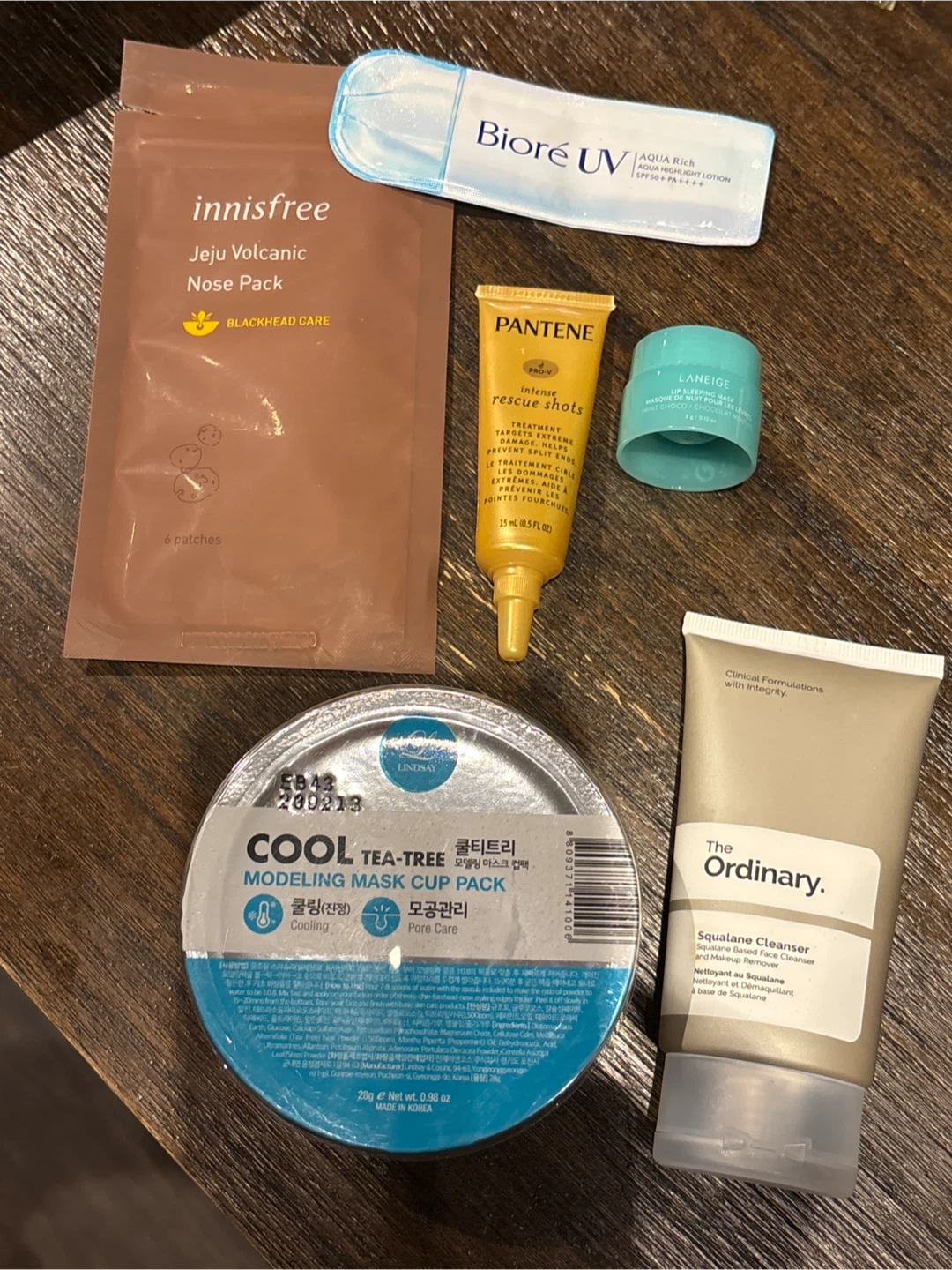 A collection of skincare items including Innisfree Jeju Volcanic Nose Pack (3 patches), Pantene Intense Rescue Shots for hair, Laneige Lip Sleeping Mask, Tea-Tree Modeling Mask Cup Pack, and The Ordinary Squalane Cleanser. All items are new, besides Nose Pack (3 individual packets inside).