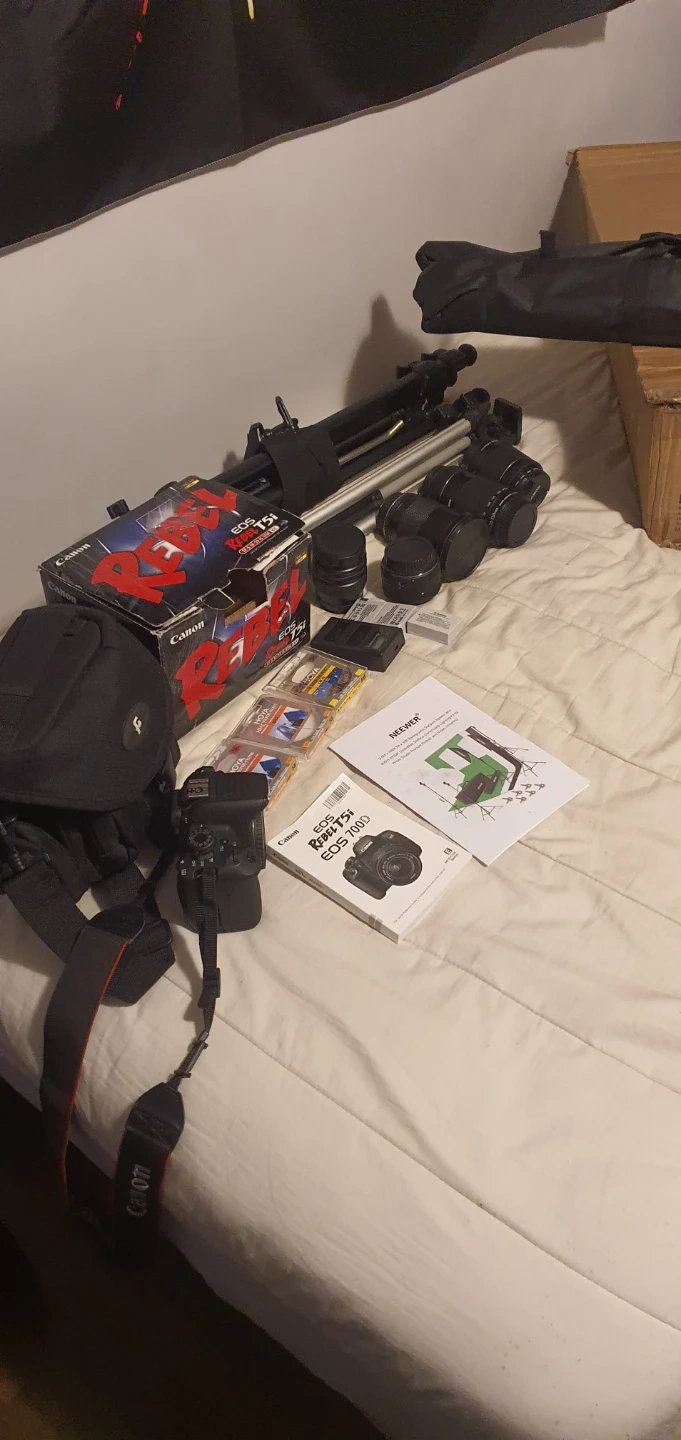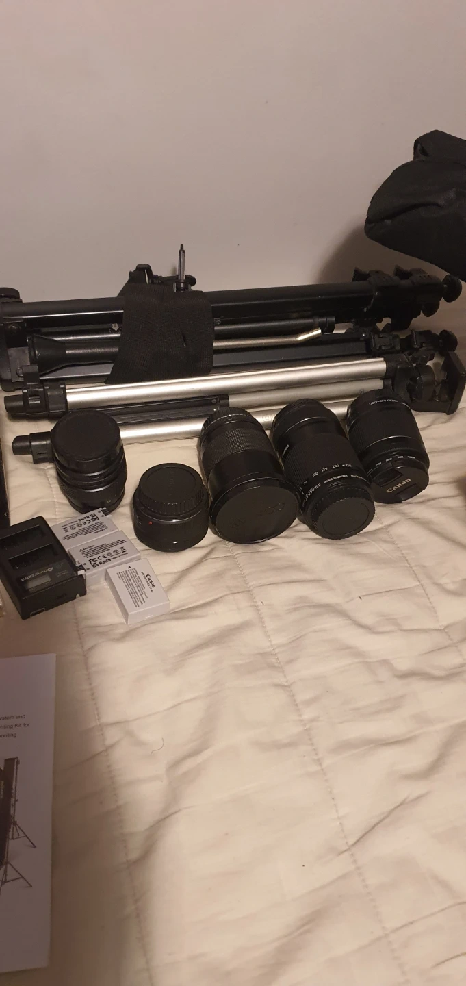 Canon T5i , 4 extra lenses, batteries and changer, bag, 2 back drops. Lights, Lenovo laptop etc.
