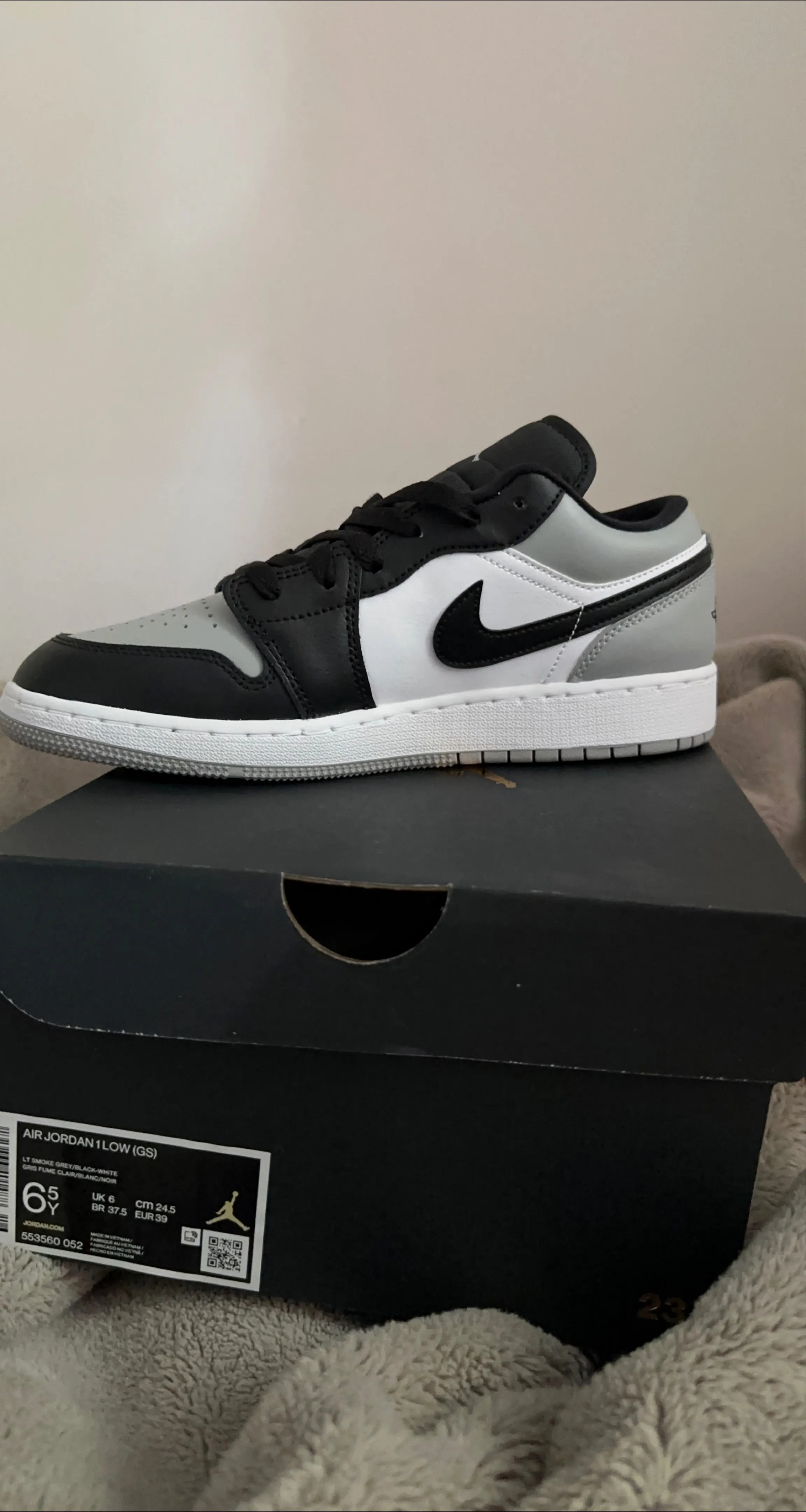 Selling a pair of Nike Air Jordan 1 Low (GS) in light smoke grey, black, and white. The size is 6.5Y, which is equivalent to a UK 6, 24.5 cm, or EUR 39. Comes with the original box!