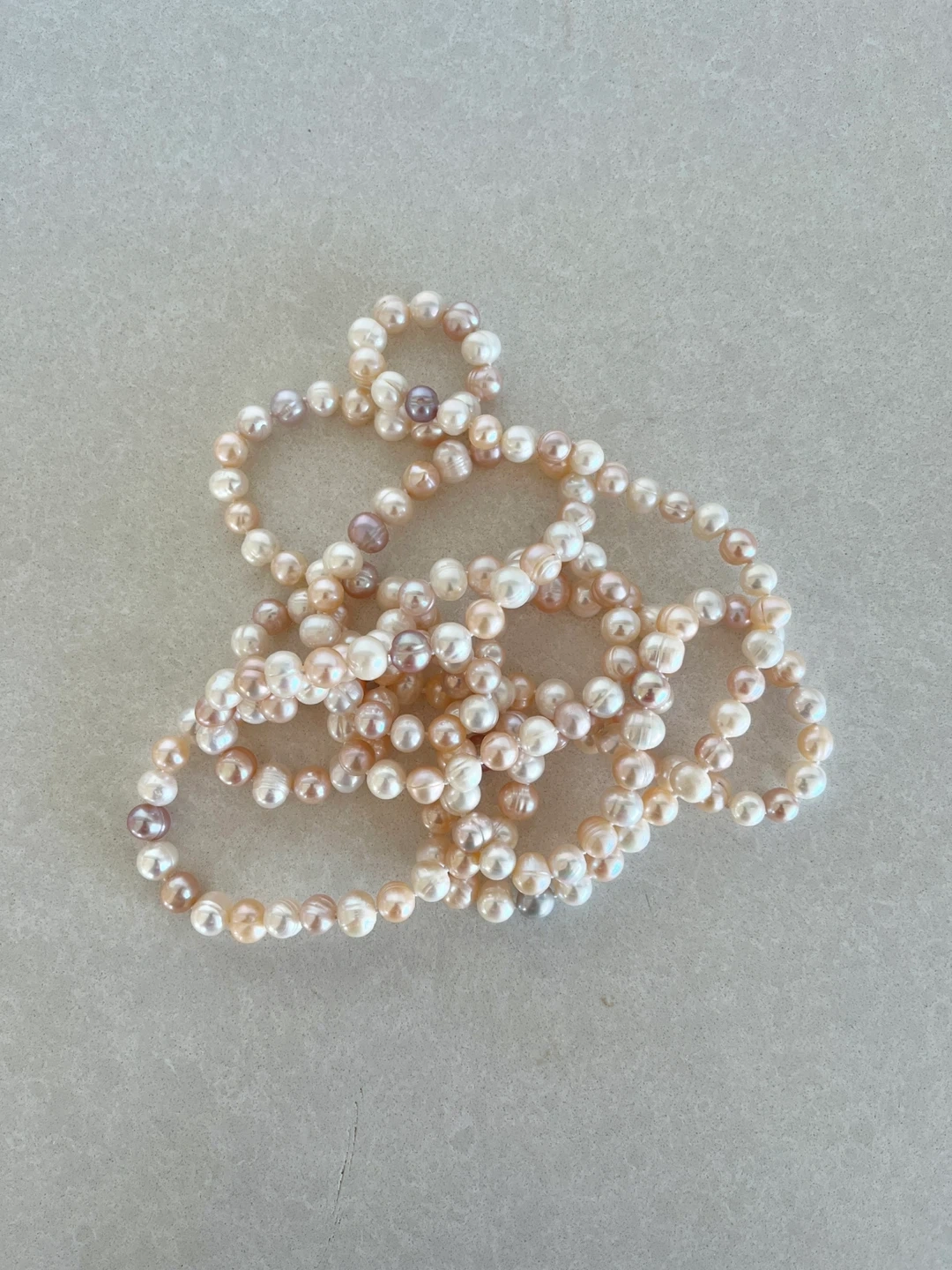 A strand of assorted freshwater pearls in varying shades of pink, cream, and lavender. These pearls have a lovely lustre and a natural, irregular shape. They're perfect for adding a touch of elegance to any outfit.