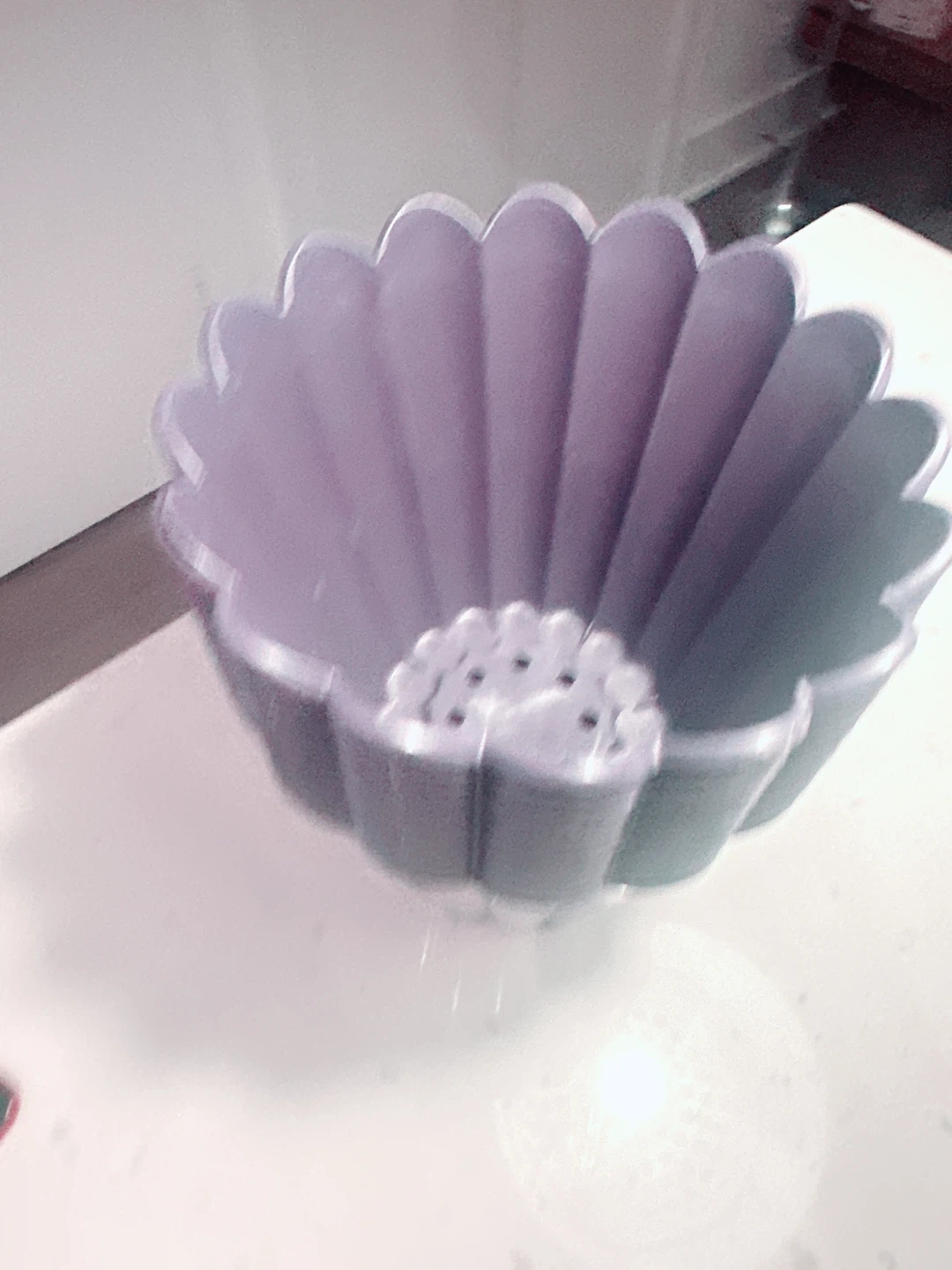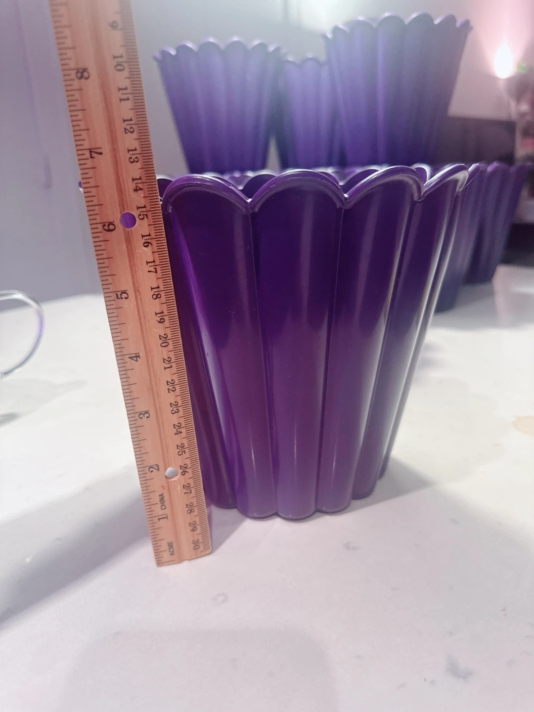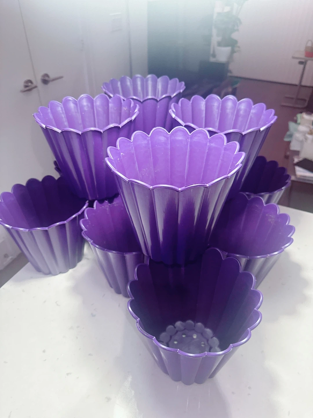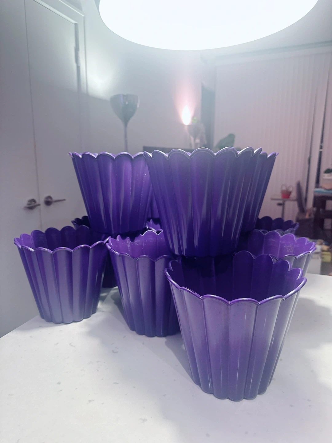 Selling a set of 13 purple plastic flower pots. They're decorative and have drainage holes at the bottom. The pots measure approximately 6 inches tall and 7 inches in diameter at the top. These would be neat for small indoor plants!