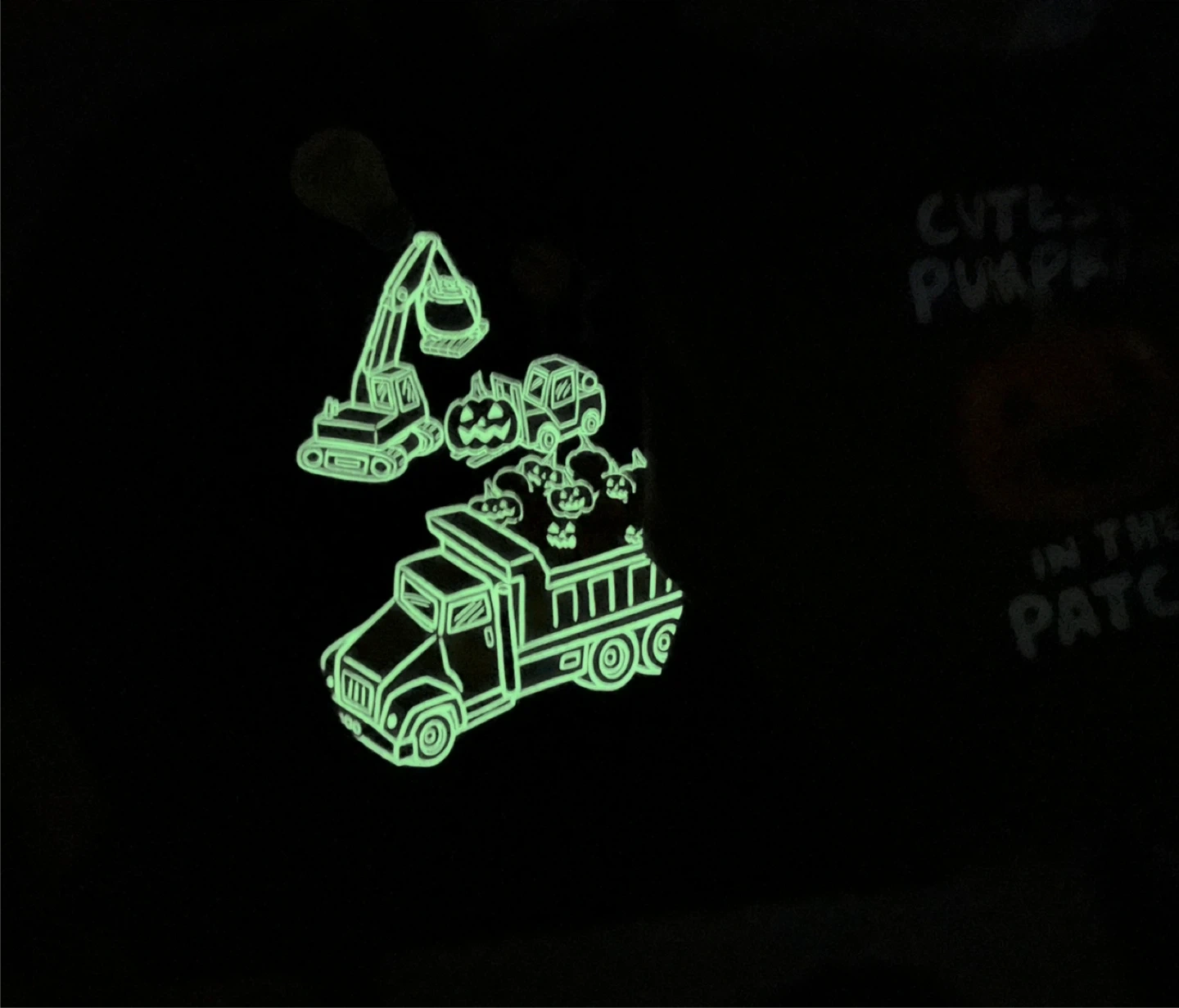 Two long sleeve shirts for kids; one black with a glow-in-the-dark construction themed and one orange with a "Cutest Pumpkin in the Patch" graphic. The bundle also includes a light blue ribbed knit beanie.