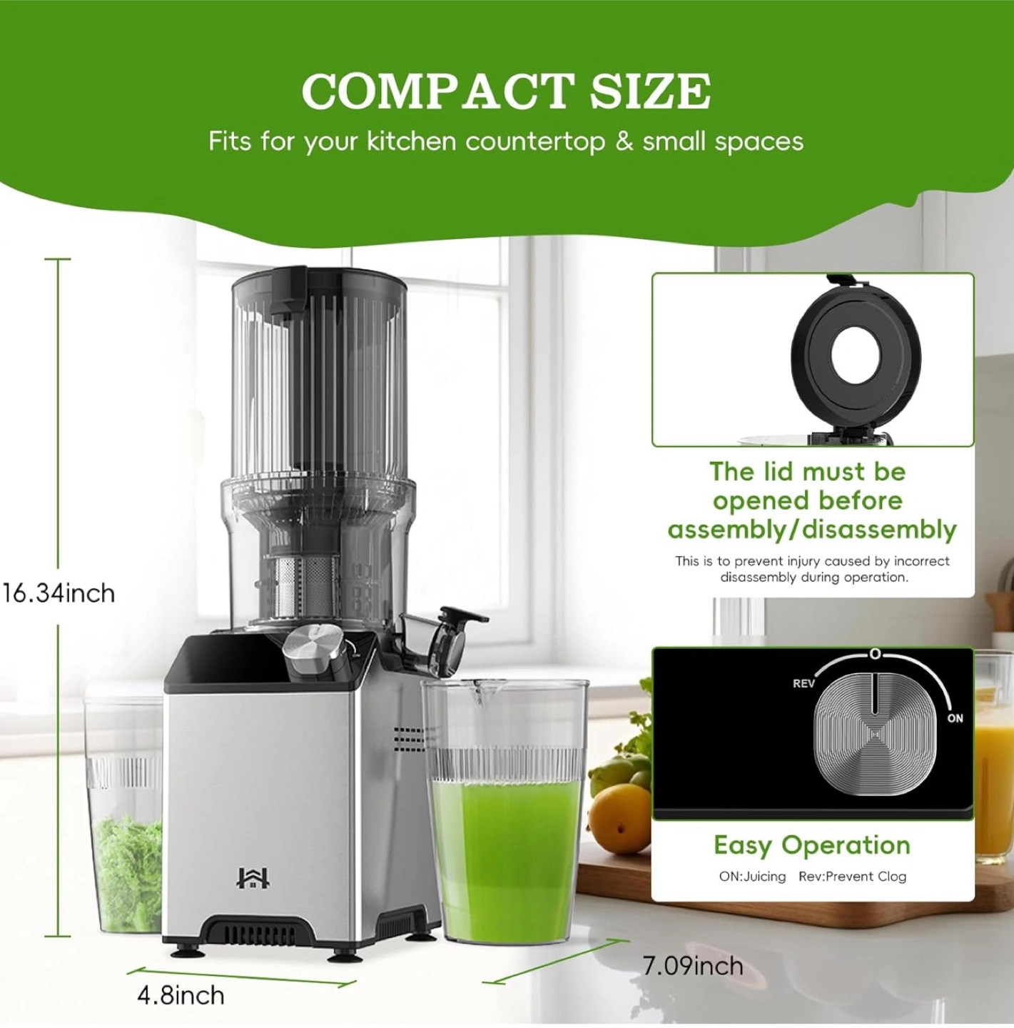 Selling a brand new Cold Press Juicer with a 4.35" wide feed chute- perfect for making fresh, healthy juice effortlessly. Designed for convenience, efficiency, and easy cleaning!