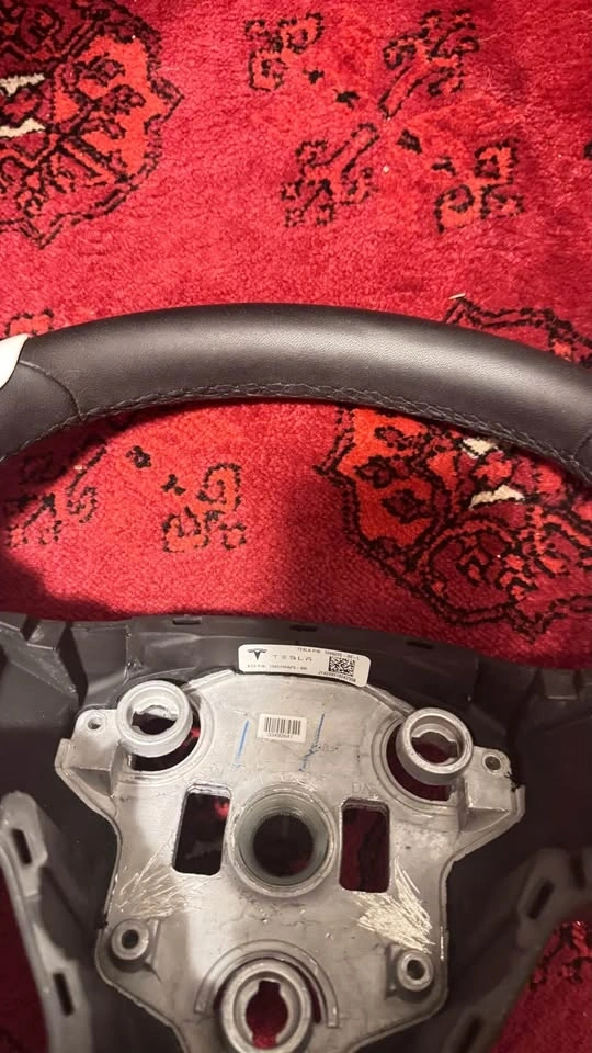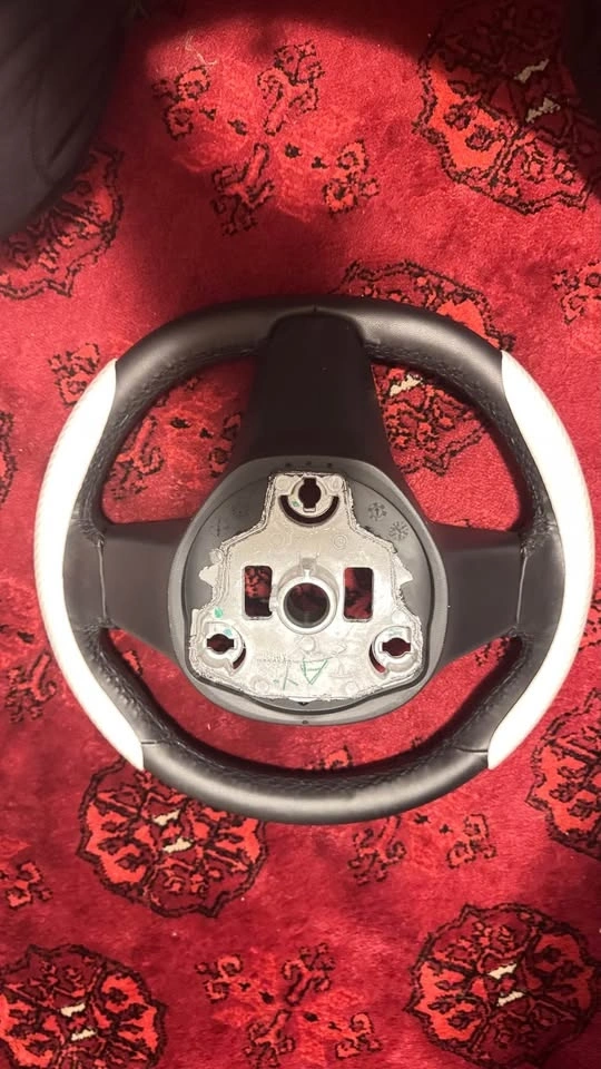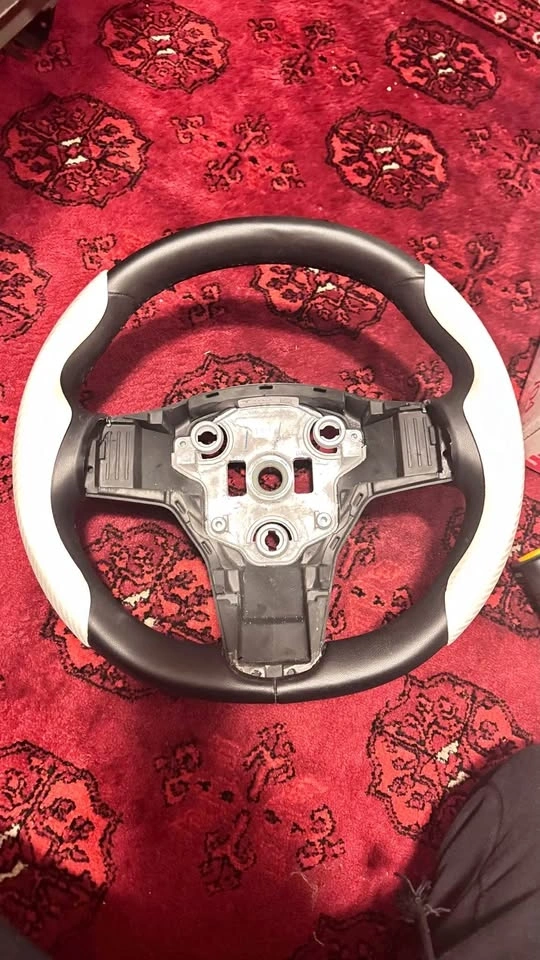 Original Tesla steering wheel for Model 3 Performance (2020). The leather is still in perfect condition. Includes two white carbon fiber covers (aftermarket) that are removable.