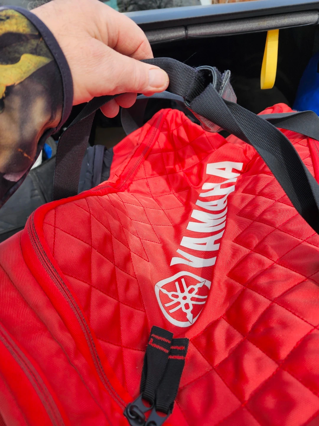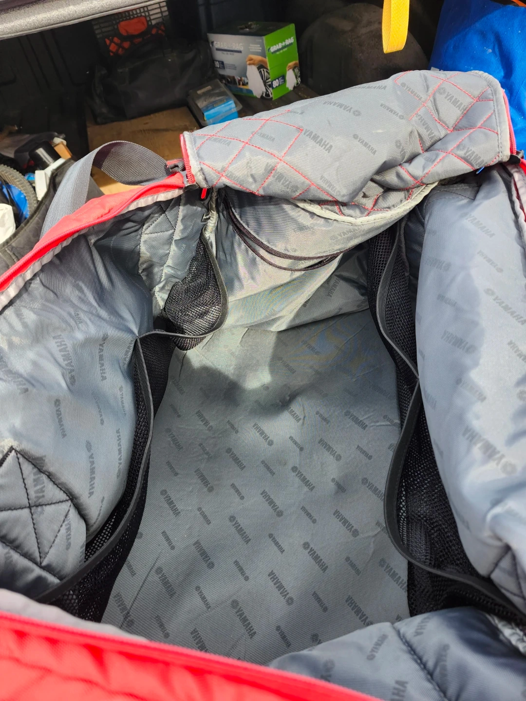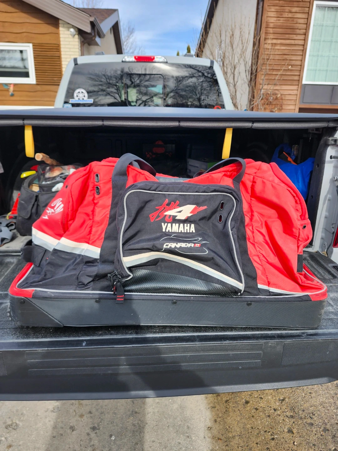 Red and black Yamaha Canada wheeled duffle bag. It has multiple compartments and straps for securing items. Great for travel or gear storage! In mint condition and clean.