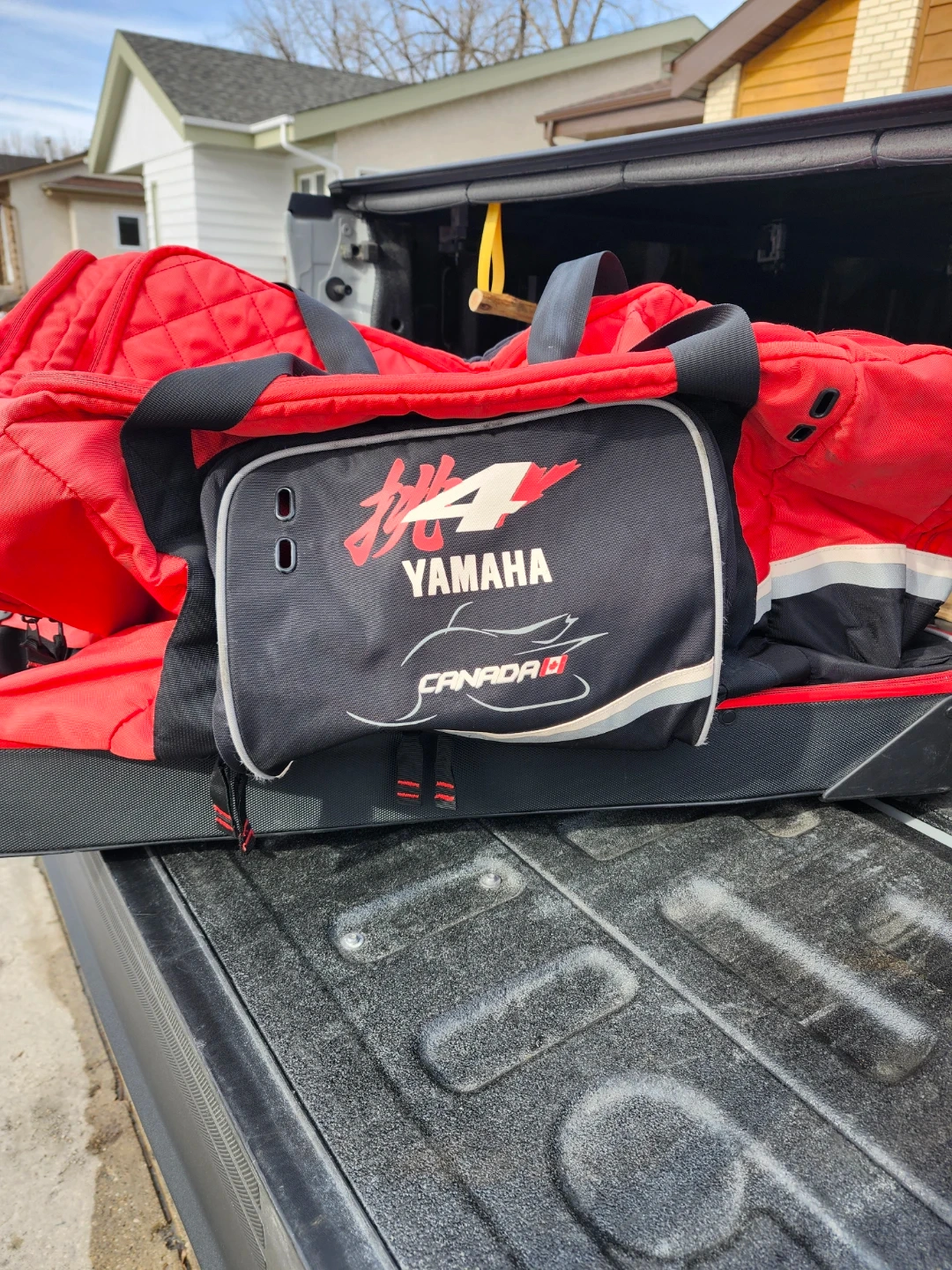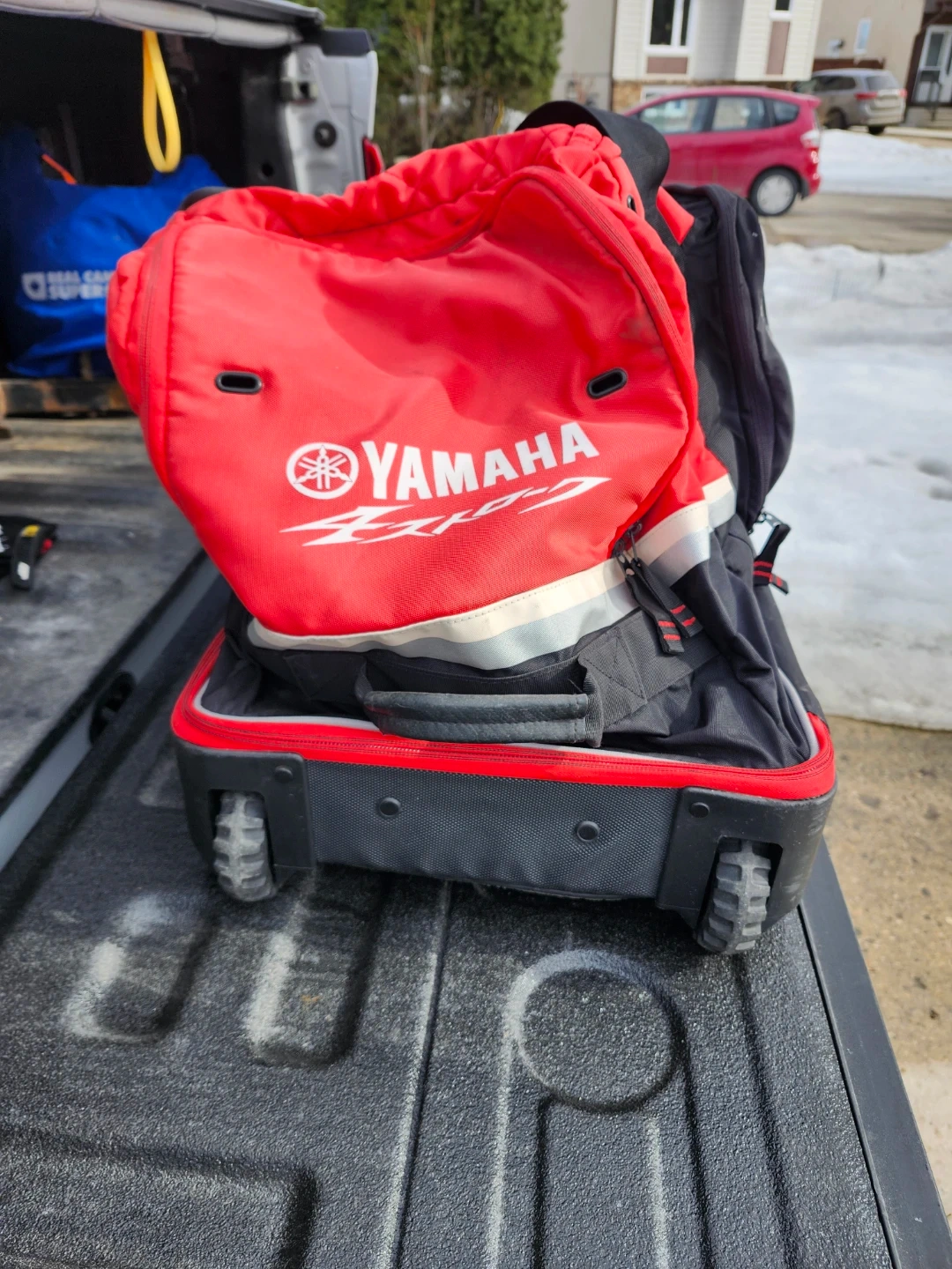 Red and black Yamaha Canada wheeled duffle bag. It has multiple compartments and straps for securing items. Great for travel or gear storage! In mint condition and clean.