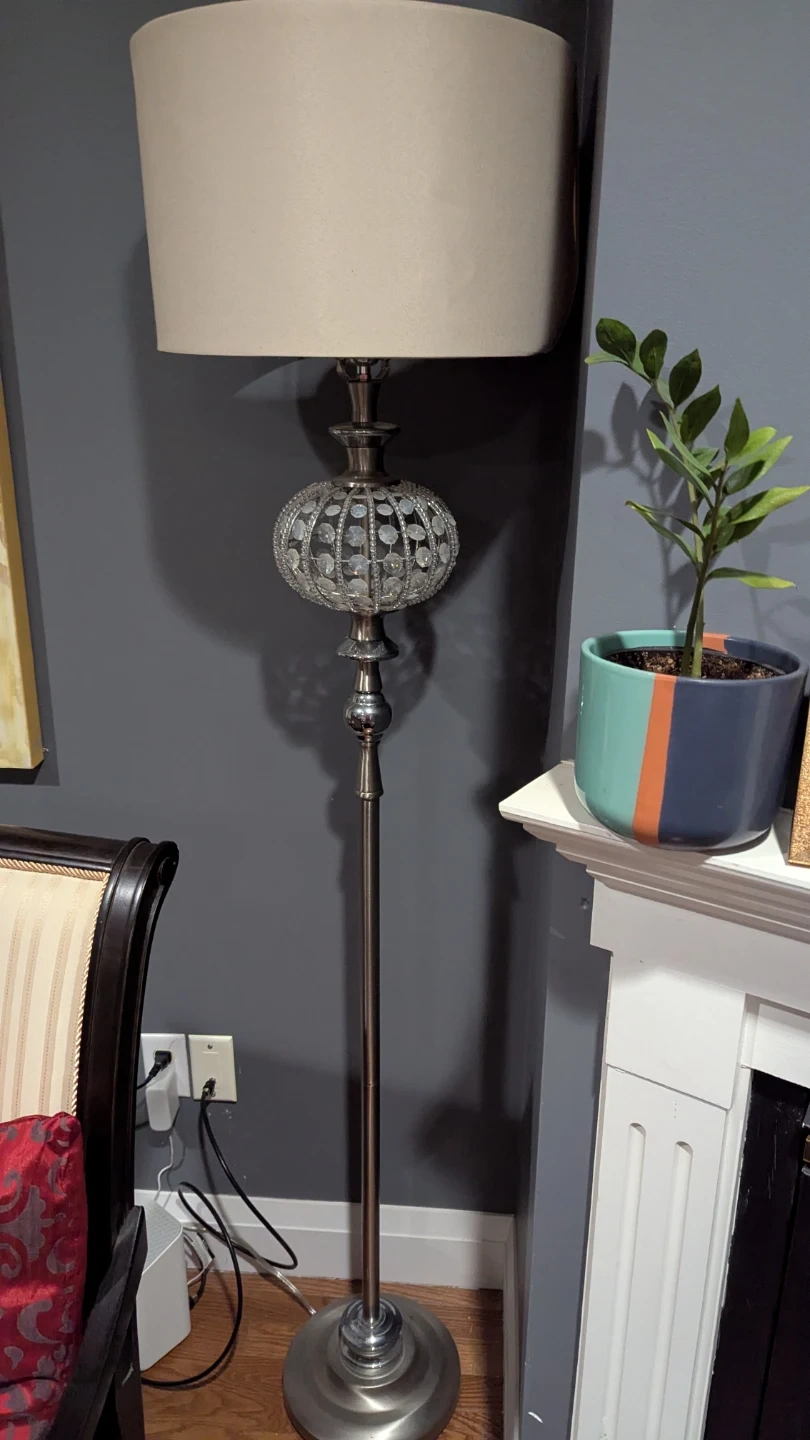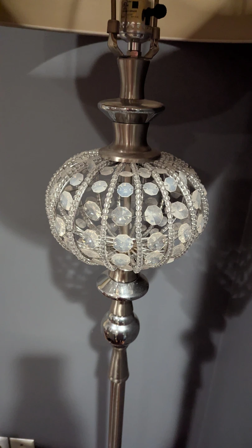This elegant floor lamp features a fabric drum shade and a decorative crystal-embellished base. It's constructed with a brushed nickel finish. Adds a touch of sparkle to any room!