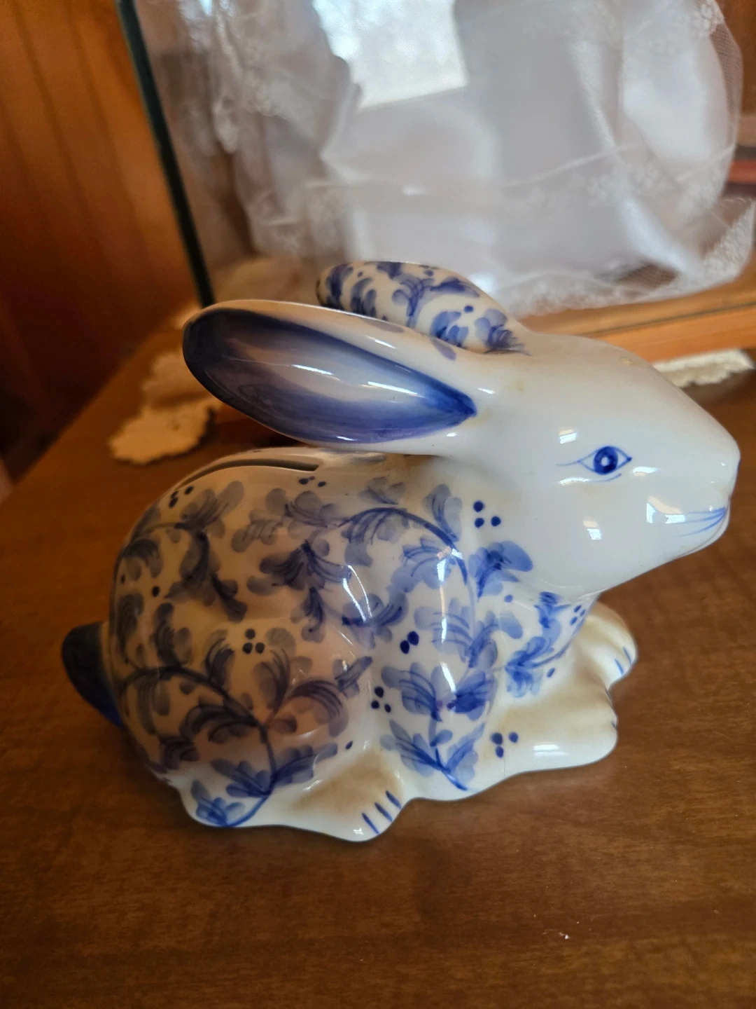 This is an Andrea by Sadek blue and white porcelain bunny rabbit coin bank.