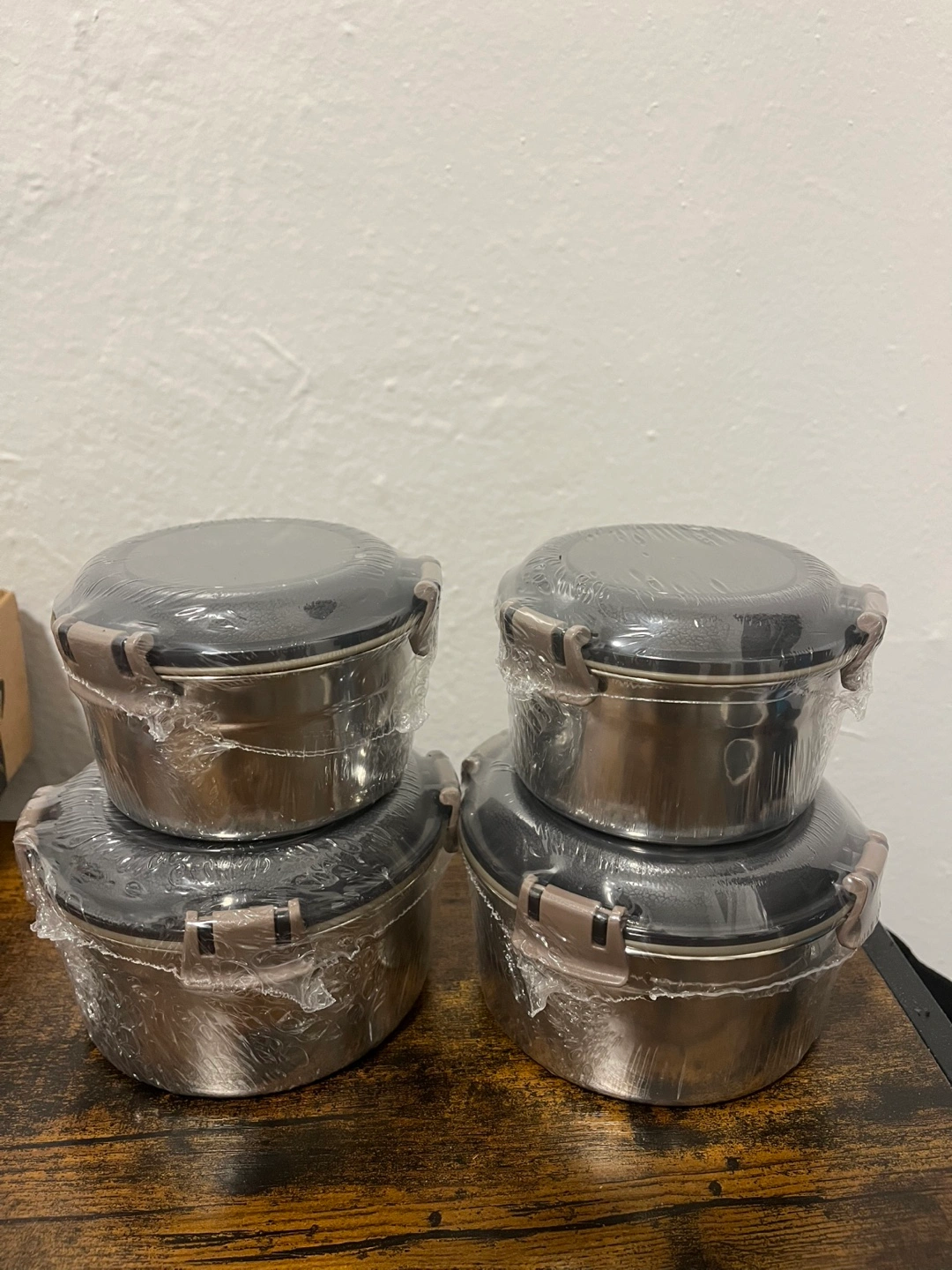 I'm selling a set of 4 brand new stainless steel food containers! They're still in their original packaging. These are perfect for meal prepping, storing leftovers, or packing lunches. They look to be in excellent condition and ready for a new home
