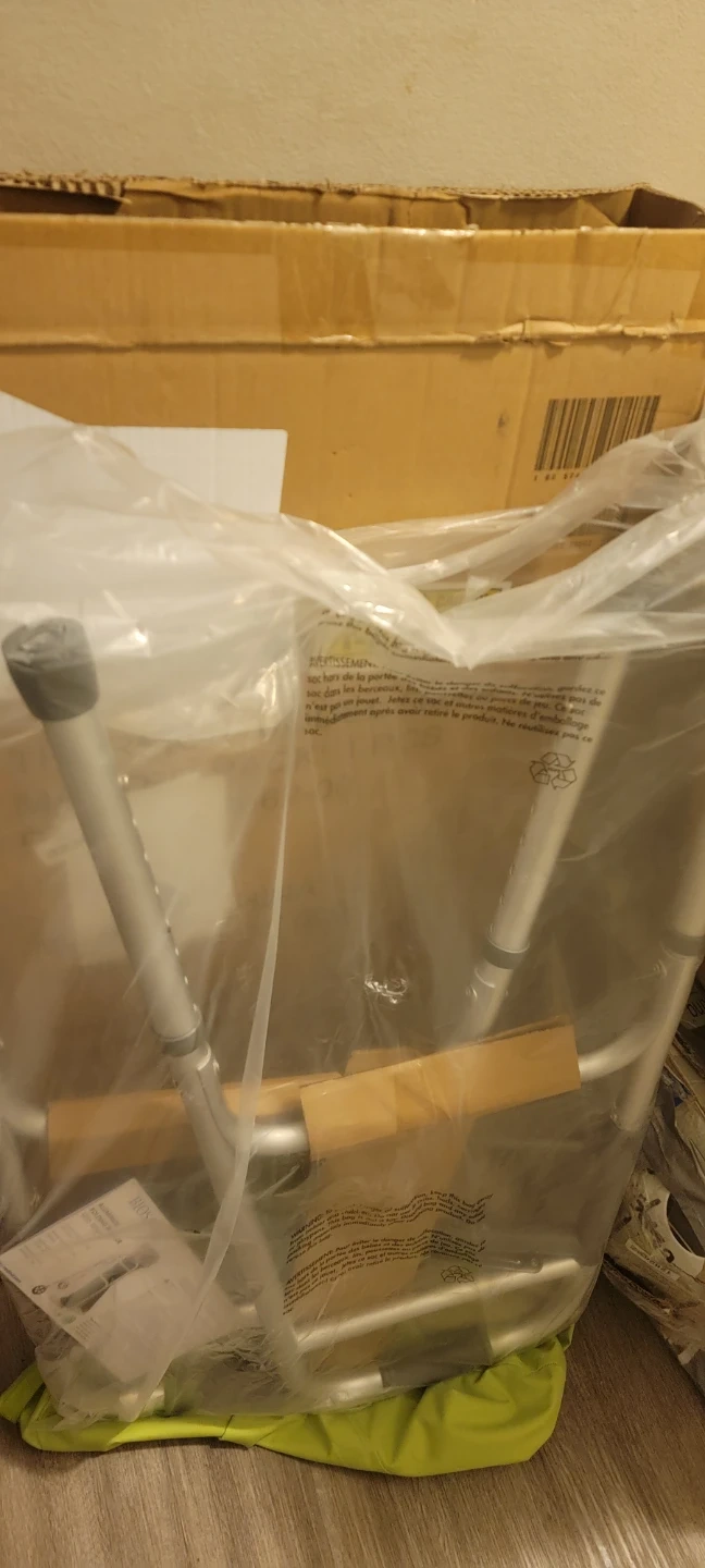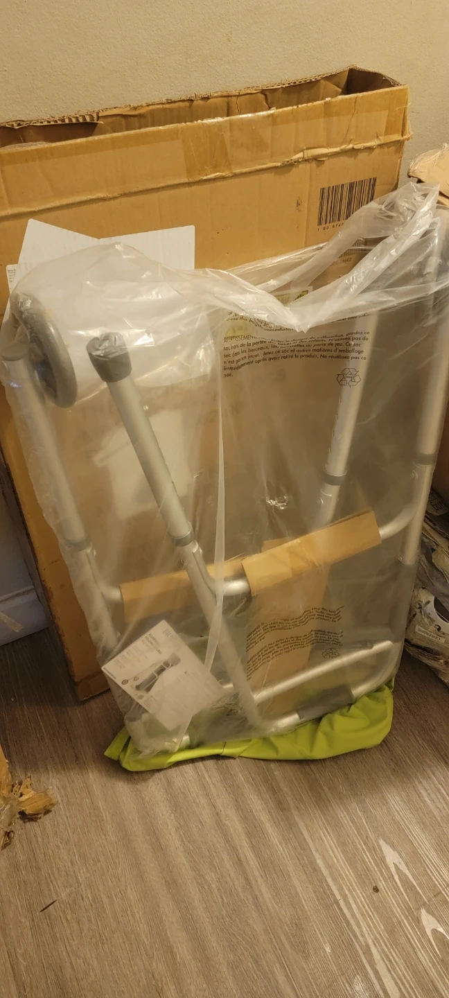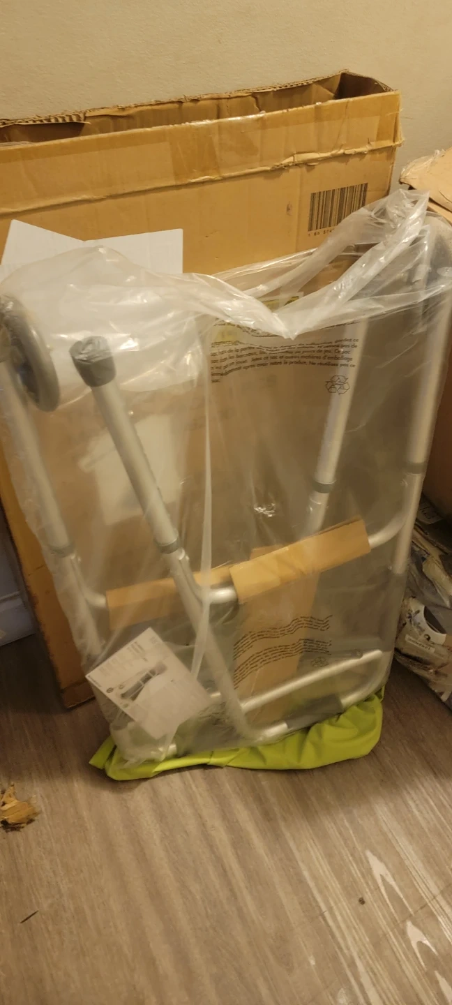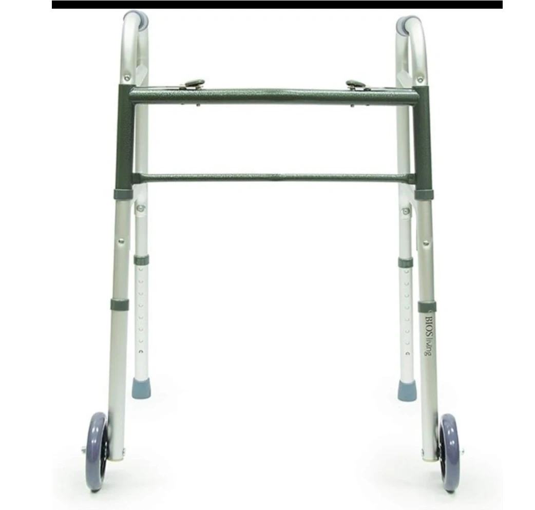 This is a BIOS Living walker, still in its original packaging. It's a foldable model with wheels, making it easy to store and transport. It's designed to offer stability and support for users. The height is adjustable to suit different users.
