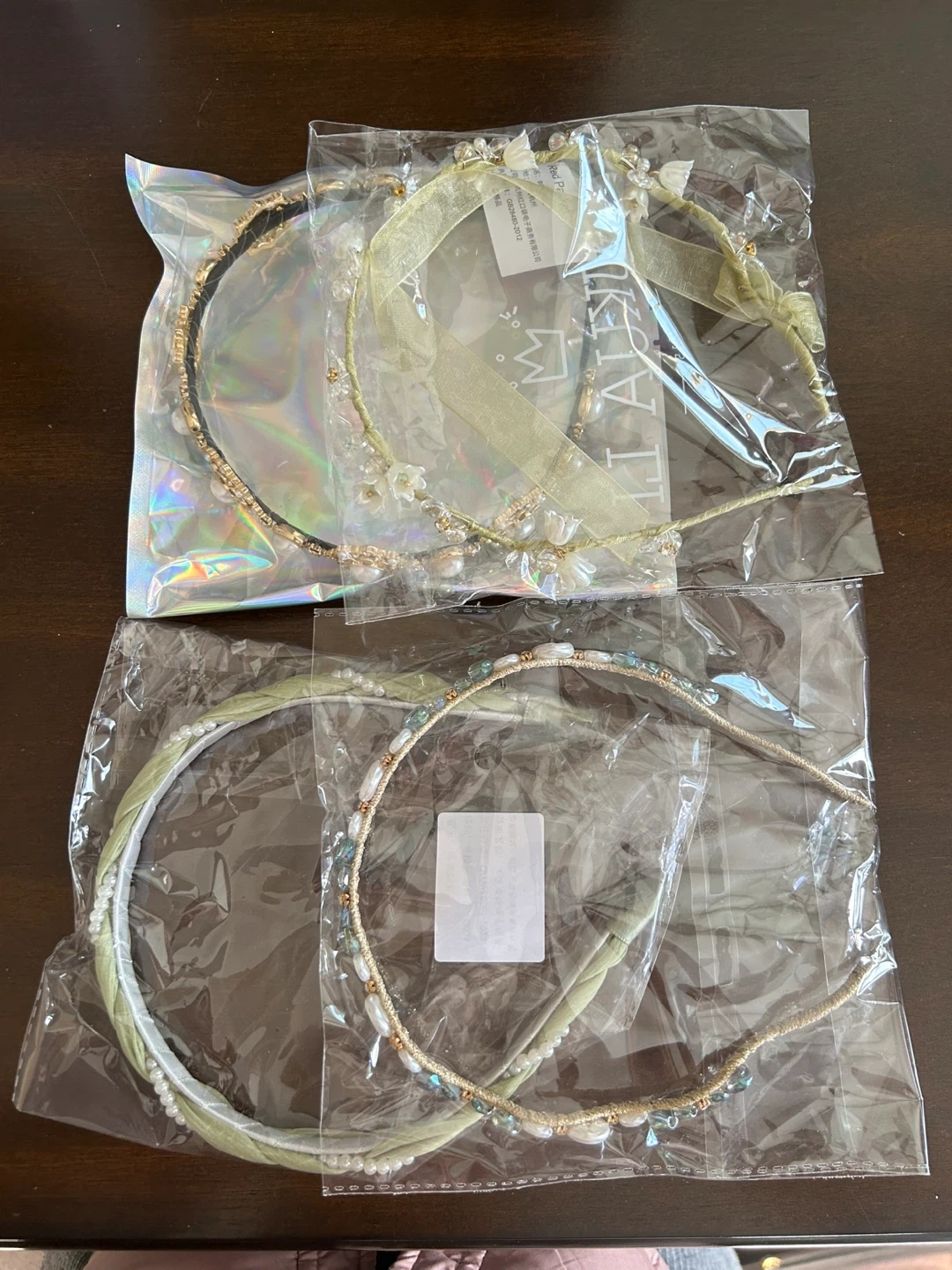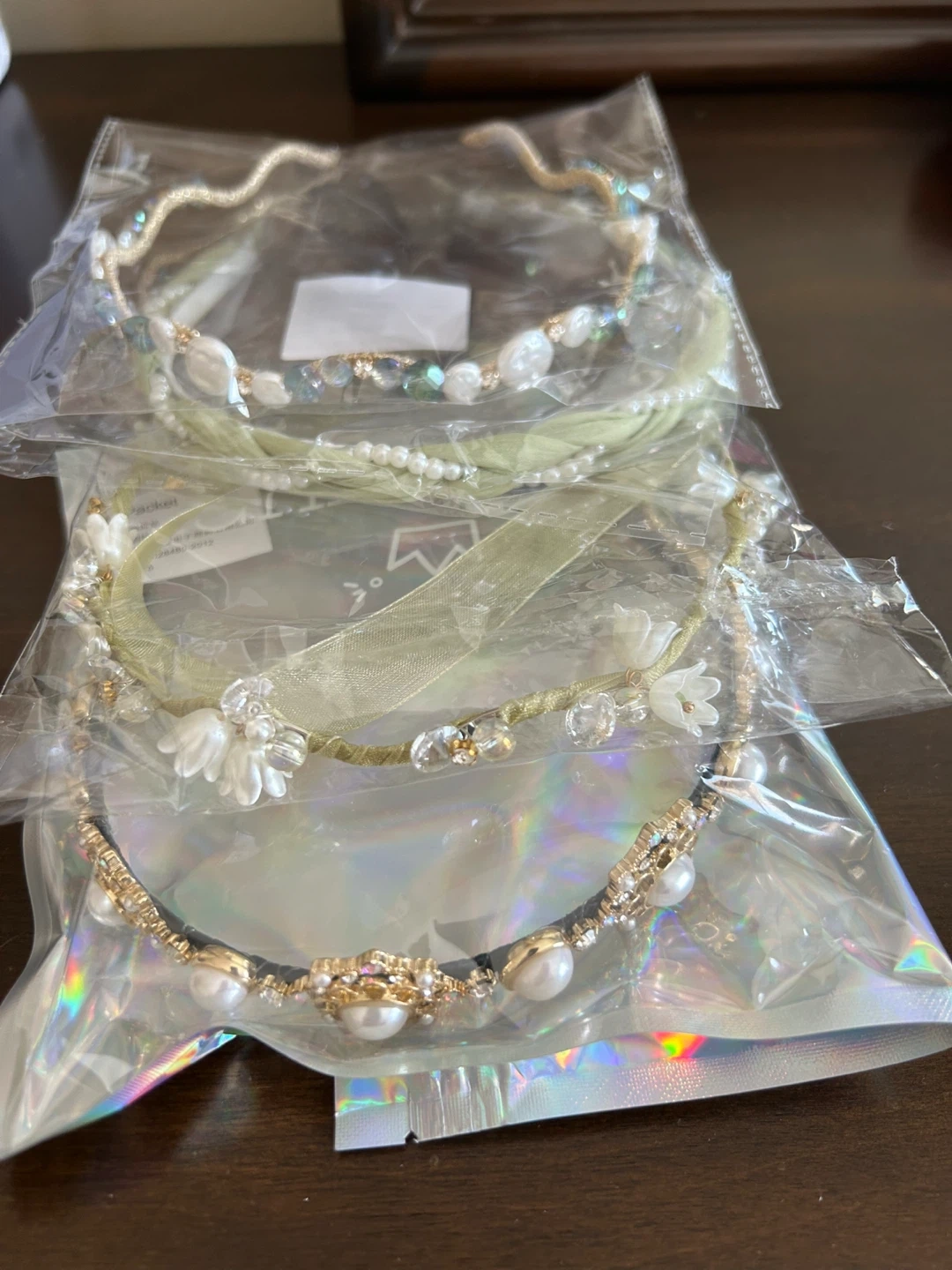NEW decorative headbands, each with unique pearl and rhinestone embellishments. They feature delicate ribbon accents and floral details. These are great for adding a touch of sparkle to any outfit! $5 each, or $15 for all four.