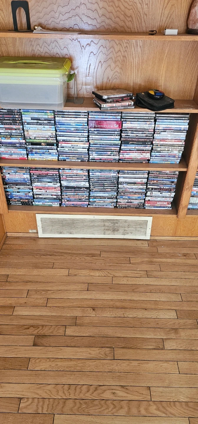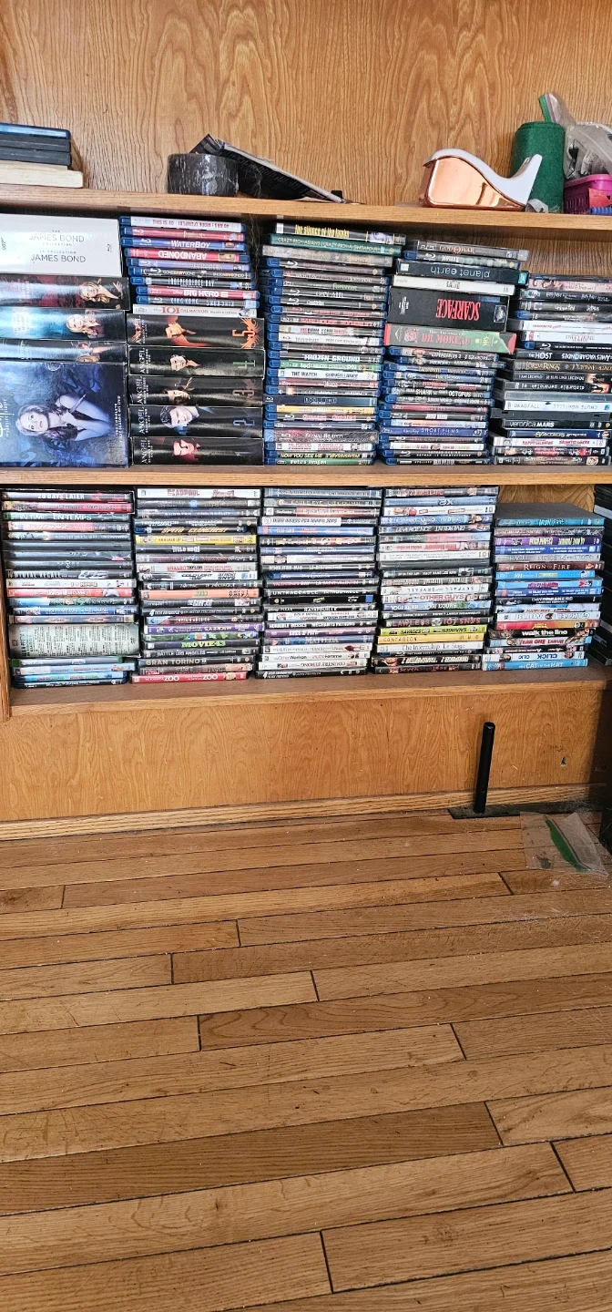Large collection of movies on DVD and Blu-ray, featuring a variety of genres. Includes titles like "Santa Clause" and the "James Bond" series. Great for movie buffs looking to expand their library!