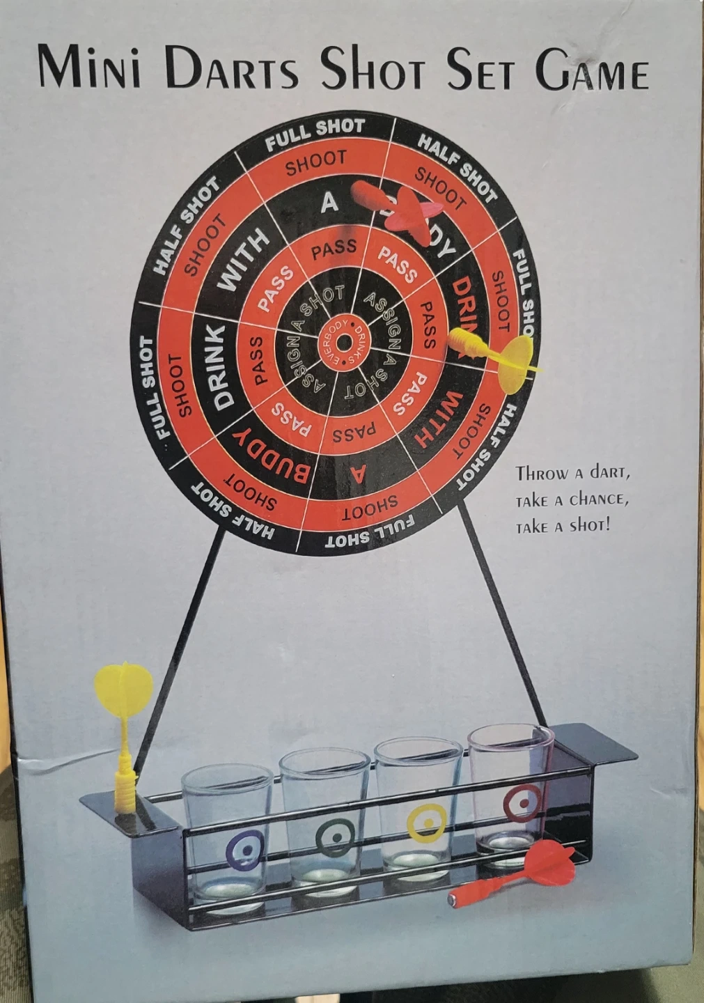 This is a darts-based drinking game for up to 4 players. Each player has a different colored magnetic dart and shot glass. Includes 4 shot glasses, 4 magnetic darts, and 1 metal dartboard/rack for storage and portability. Product is not dishwasher or microwave safe.