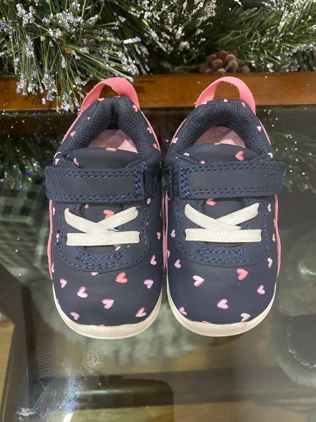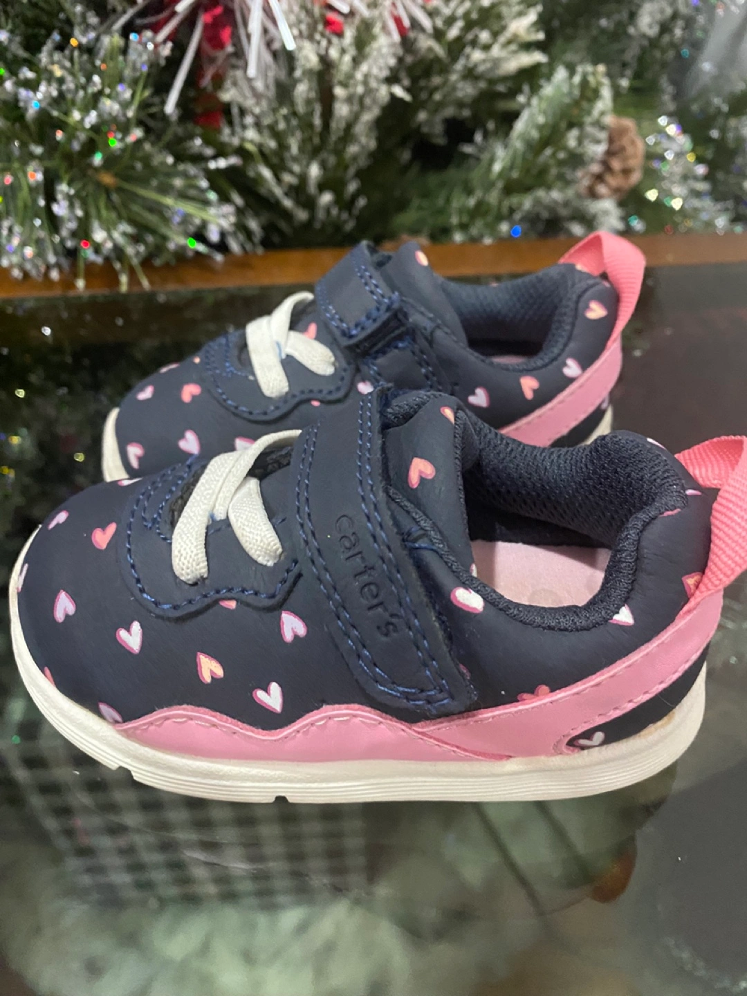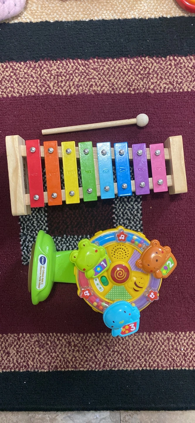 Adorable baby bundle includes a colourful sensory cube with lacing toy, a wooden xylophone, a musical spinning toy with lights and sounds, and a pair of Carter's baby shoes with a heart pattern. Perfect for early development and playtime.