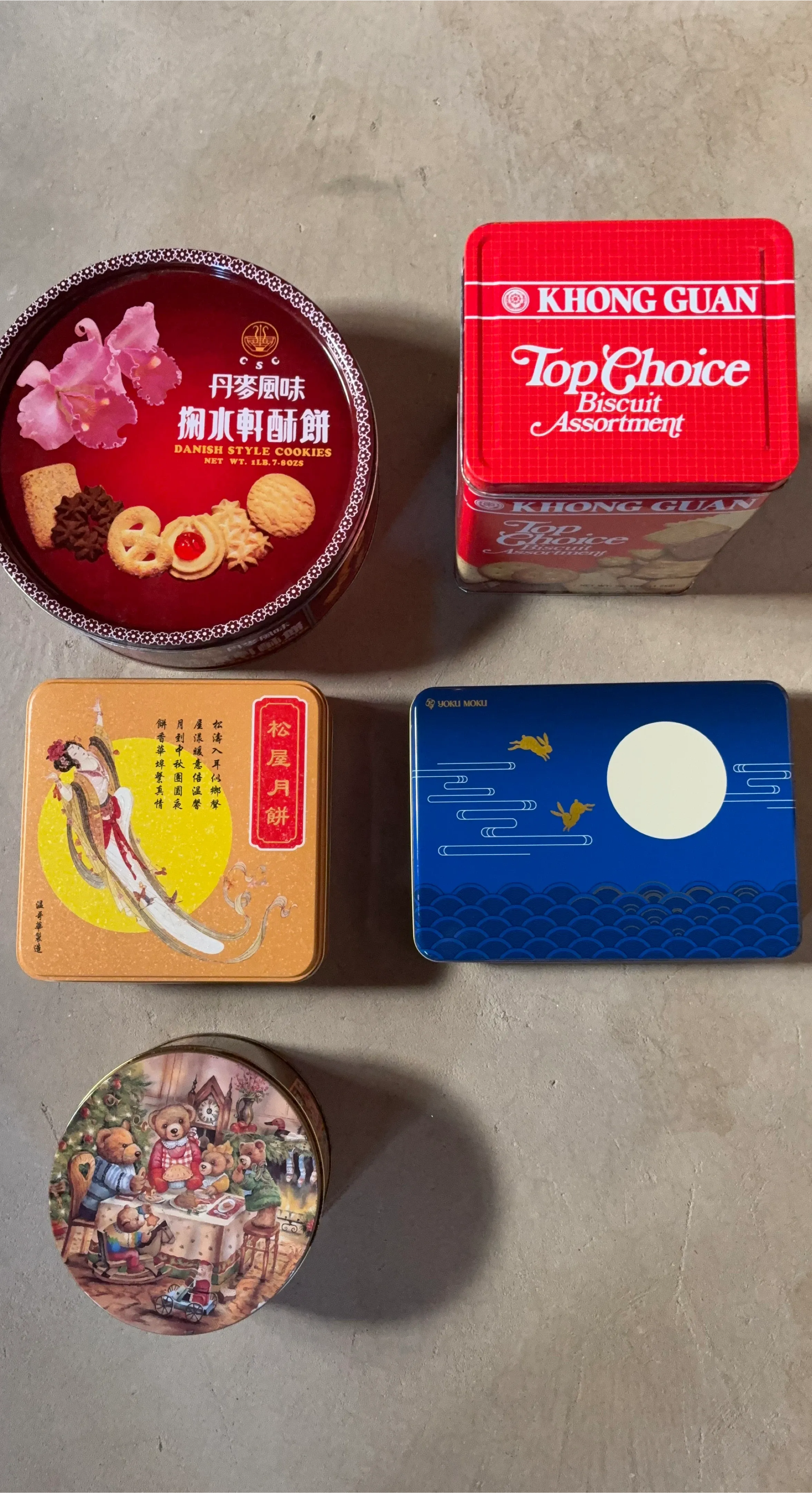 Selling a collection of assorted biscuit tins! Includes brands like Khong Guan, Yoku Moku, and Danish Style Cookies. Perfect for storage or decoration! The tins are in different shapes and sizes for variety.