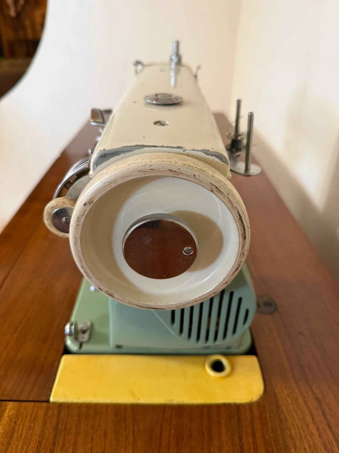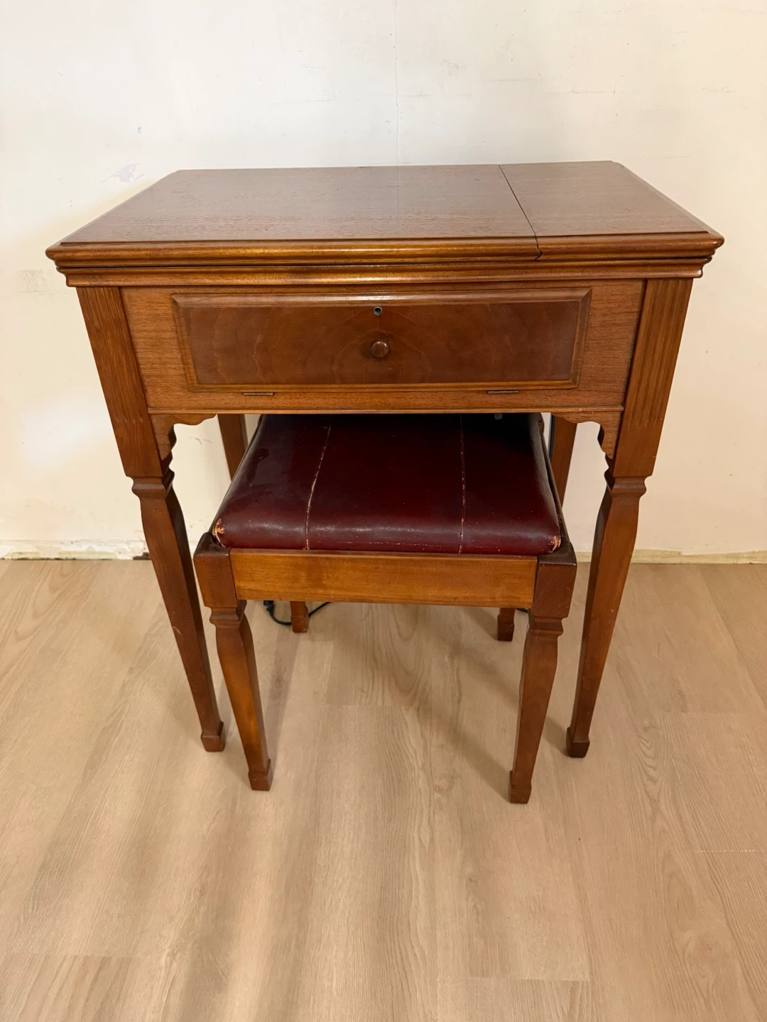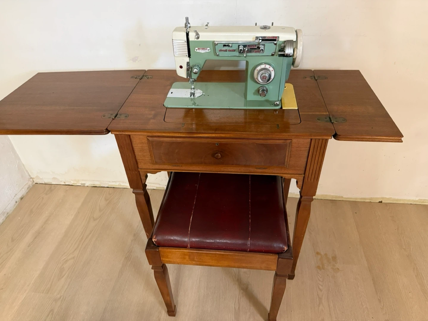 Vintage Universal sewing machine and matching wooden table with drop-leaf sides. Includes a padded stool. This set's perfect for any sewing enthusiast looking for a classic piece!