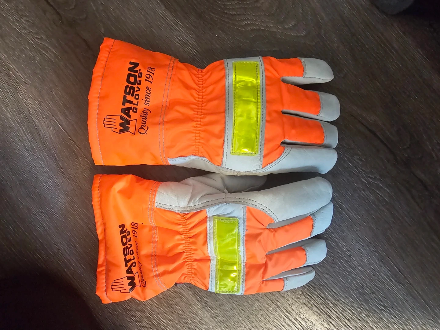 These Watson gloves are hi-vis orange with reflective stripes for added visibility. They're made with durable materials for tough jobs. Great for work or outdoor activities!