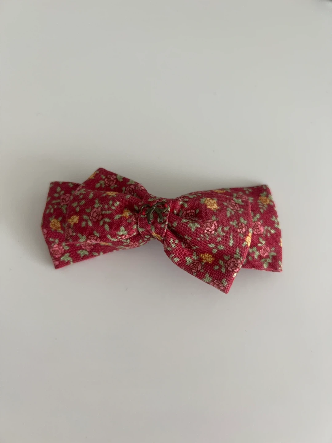 Cute red floral patterned bow hair clip. Attached with a silver metal clip for secure wear. Adds a touch of charm to any hairstyle!