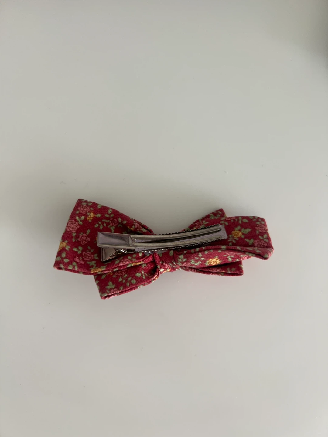 Cute red floral patterned bow hair clip. Attached with a silver metal clip for secure wear. Adds a touch of charm to any hairstyle!