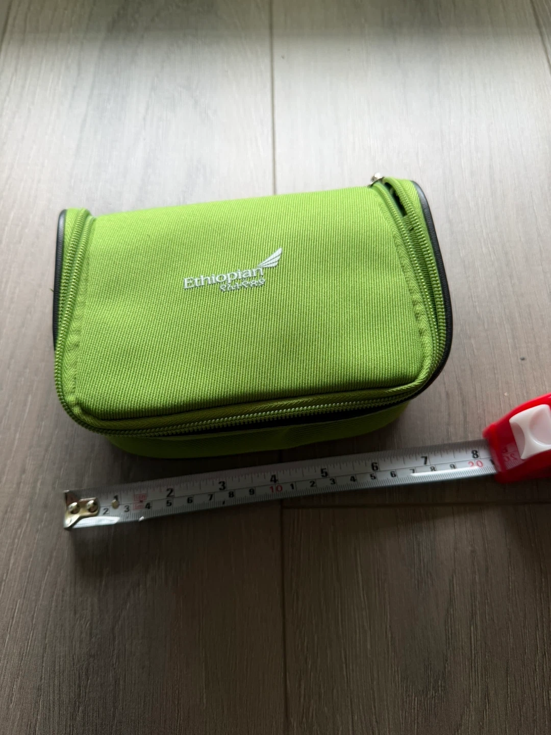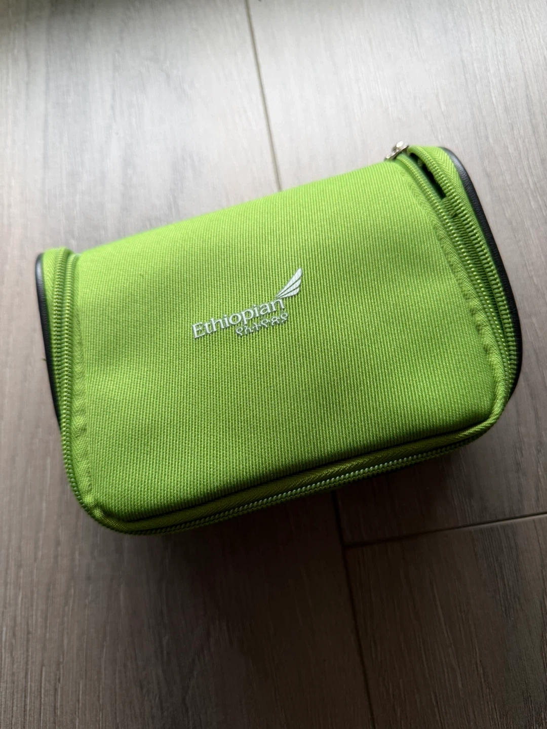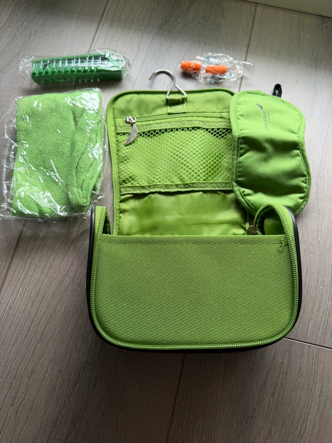 Green toiletry bag with multiple compartments and a hanging hook. Includes a small washcloth, a toothbrush holder, and other travel accessories. It's perfect for keeping your essentials organized on the go!