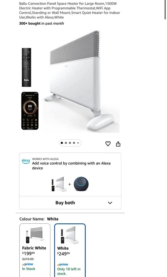 Ballu convection panel space heater in excellent condition. Powerful 1500W heating ideal for large rooms. Features WiFi app control, programmable thermostat, and Alexa voice control. Quiet operation with modern slim design. Can be used freestanding or wall mounted. Smart app & voice control, Energy-efficient heating, Silent operation, Overheat & tip-over safety protection, Clean white finish.