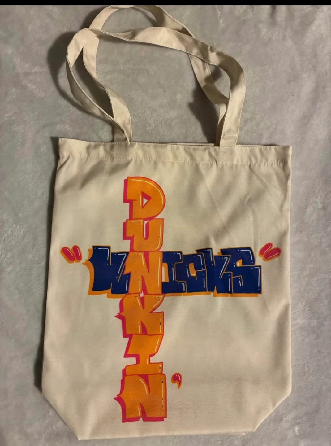 This canvas tote bag features a unique graphic design with Dunkin' branding and a New York City theme. It's a reusable bag with a full graphic print on one side. The bag is made of durable canvas.