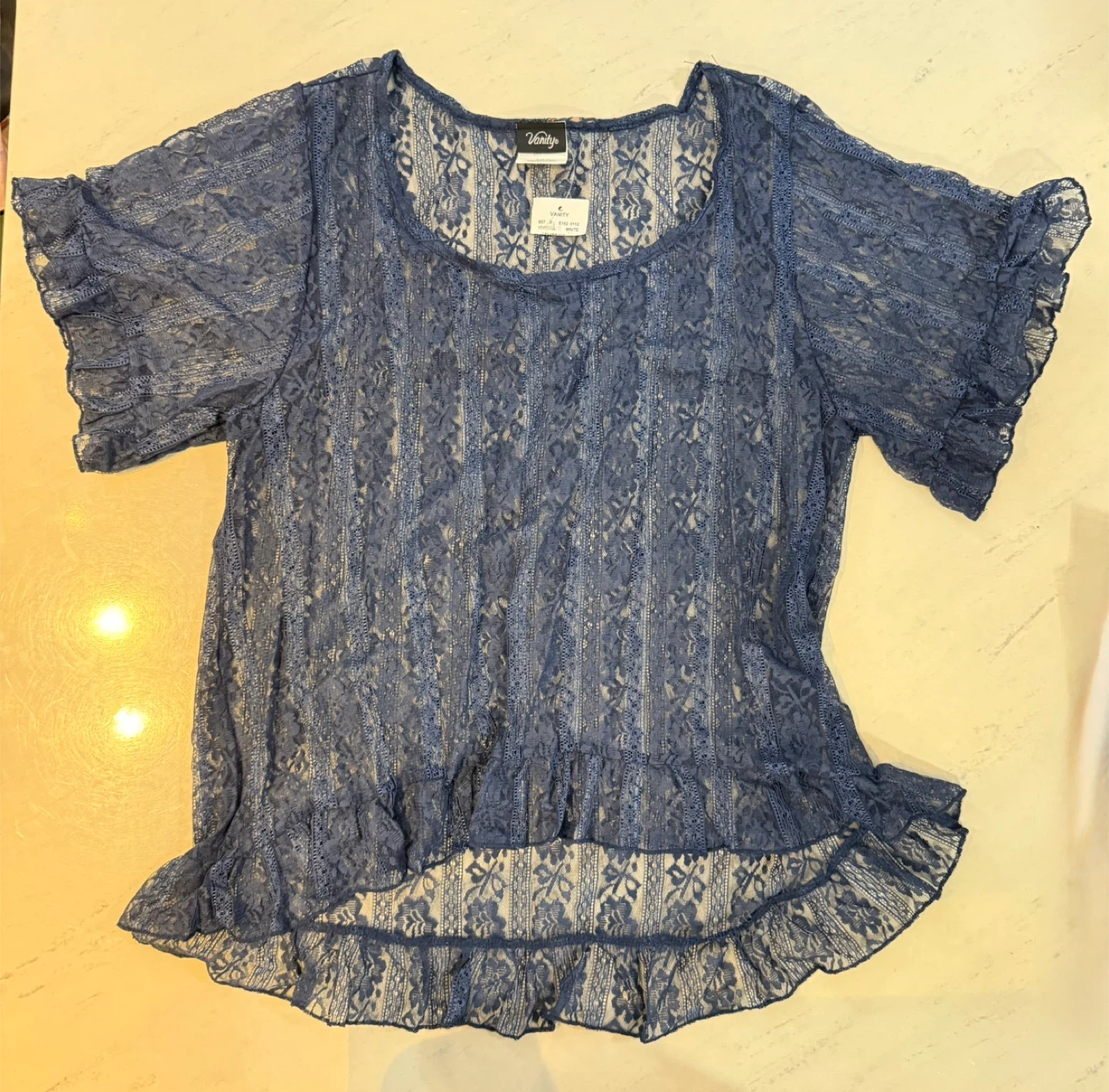 Blue lace top with short flutter sleeves. It's made of a sheer lace fabric with a floral pattern. This top is great for layering over other garments.
