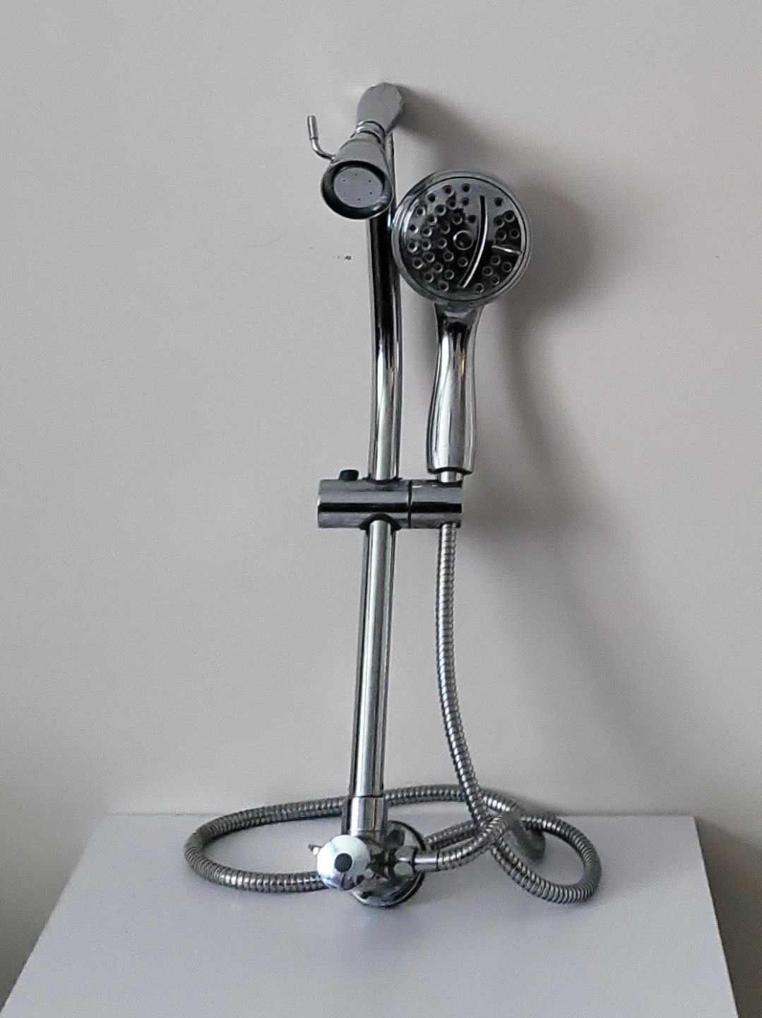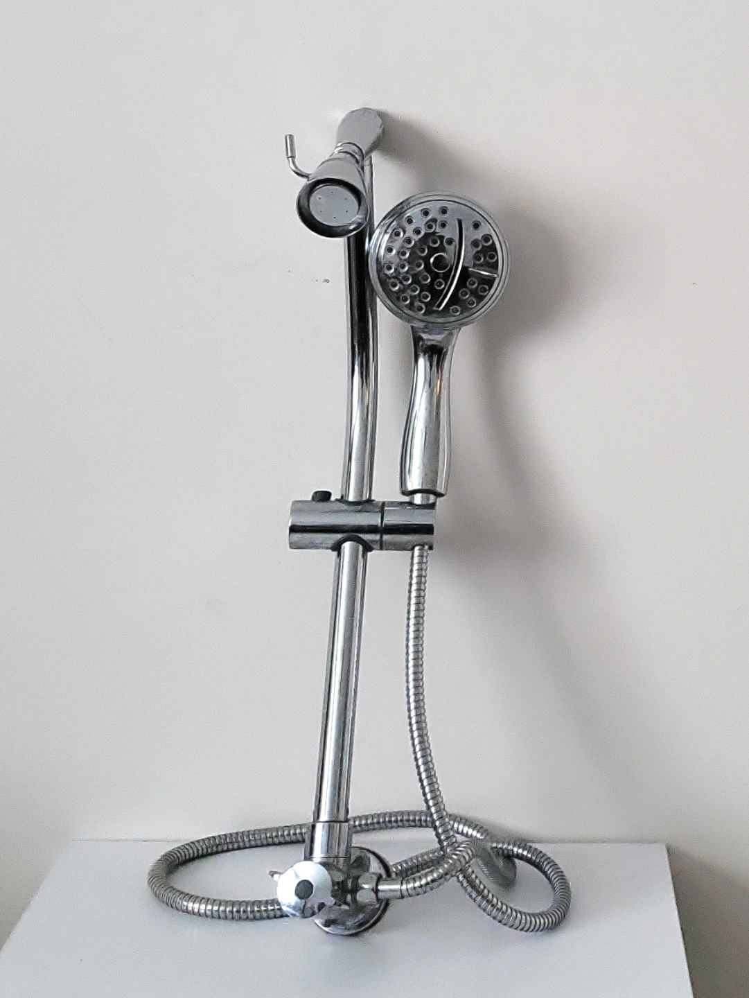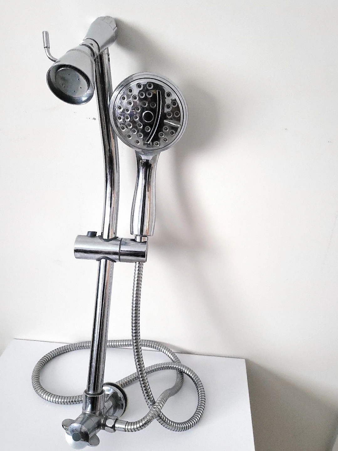 Adjustable sliding shower bar. Two shower heads. Chrome finish. Metal hose. Easy installation.