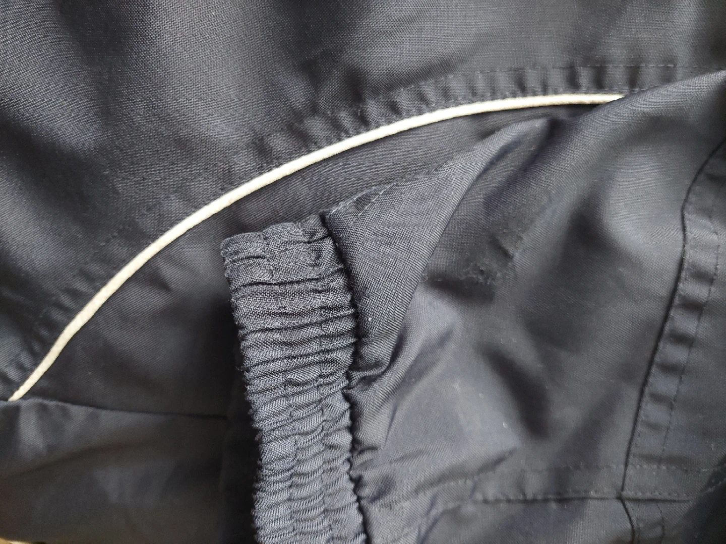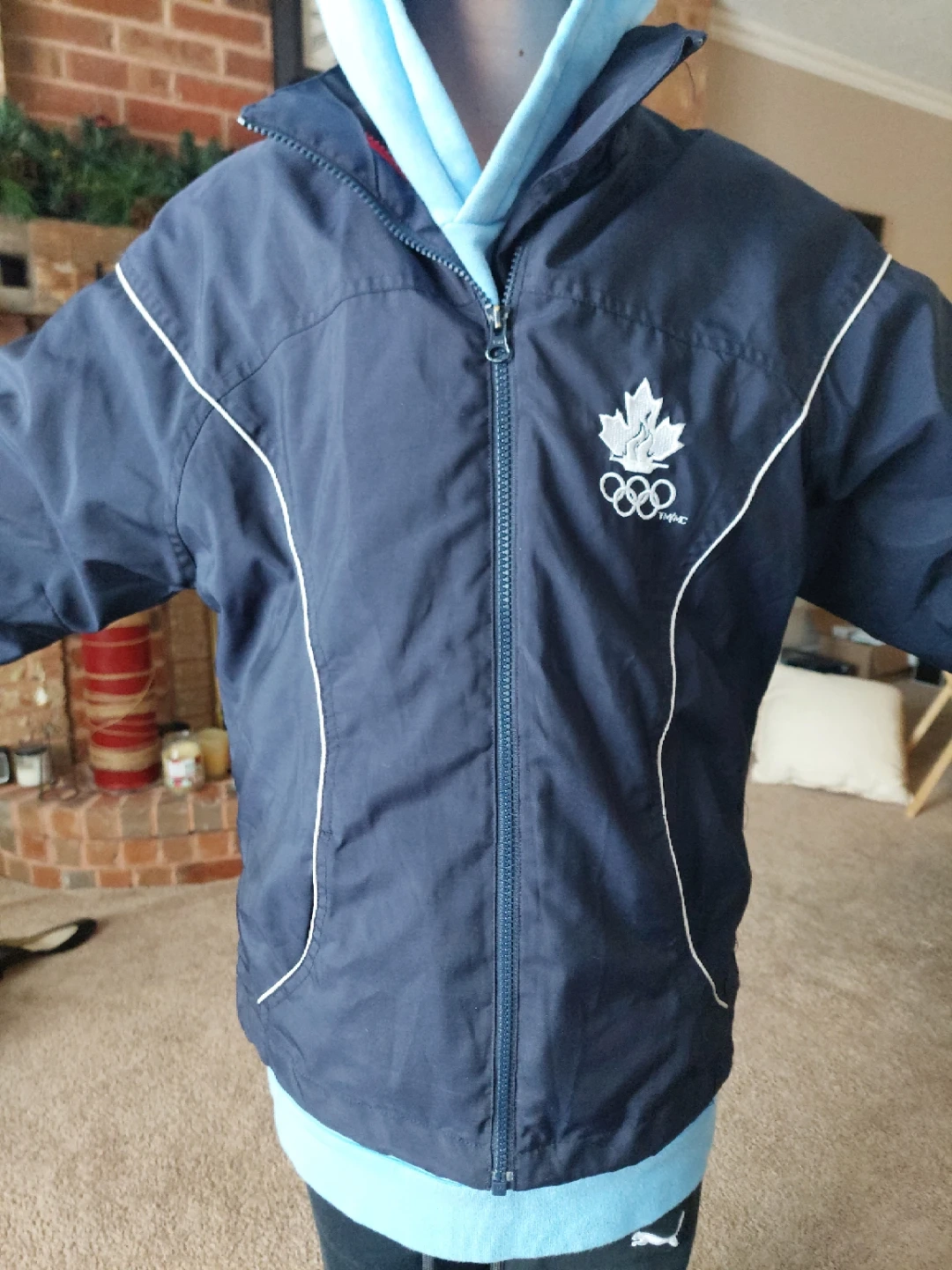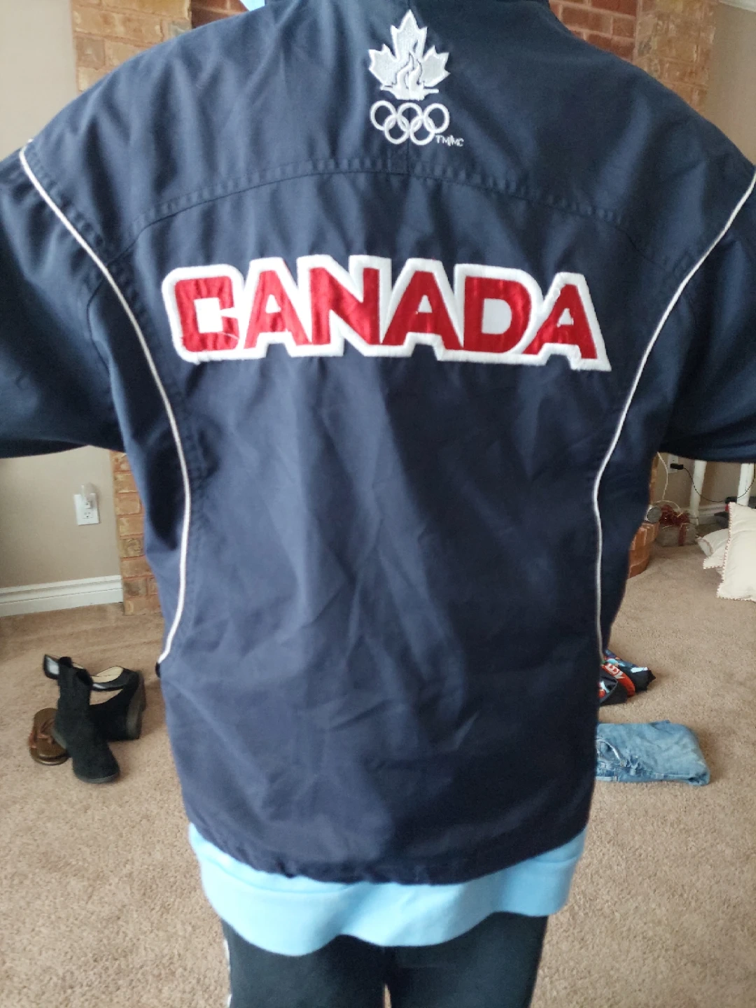 Here's a Canada Olympics jacket in good condition! It's a navy blue colour with a maple leaf and the Olympic rings on the front. The back has 'CANADA' printed in red. The inside is lined with red mesh.