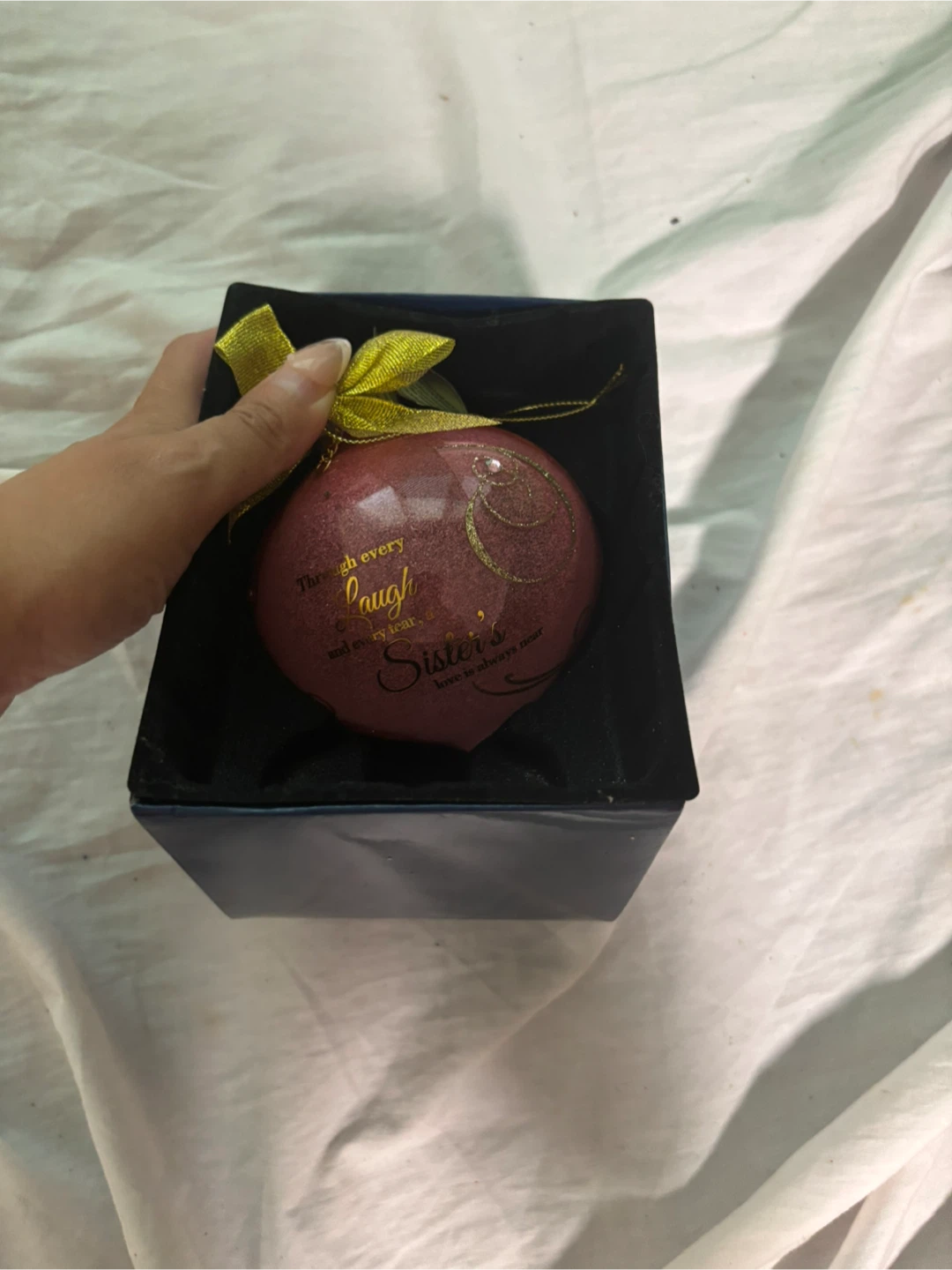 This is a sweet ornament that celebrates sisterhood. It comes in its original box and is in great condition. The ornament has a lovely design with the words "Through every laugh and every tear, a sister's love is always near" written on it