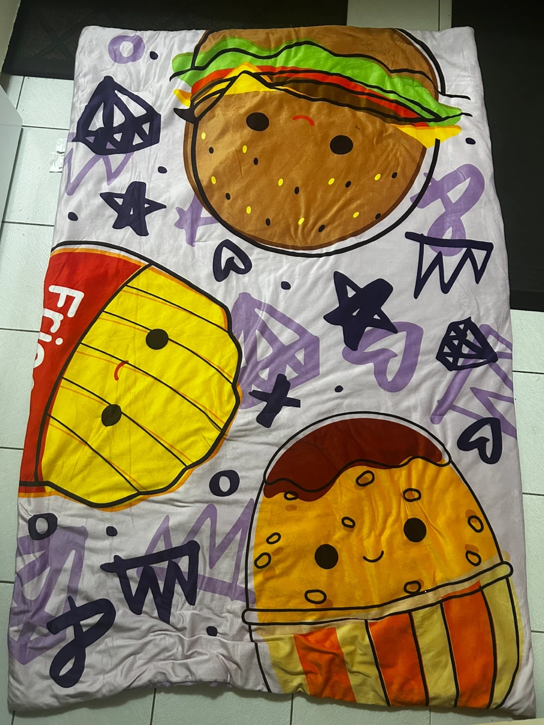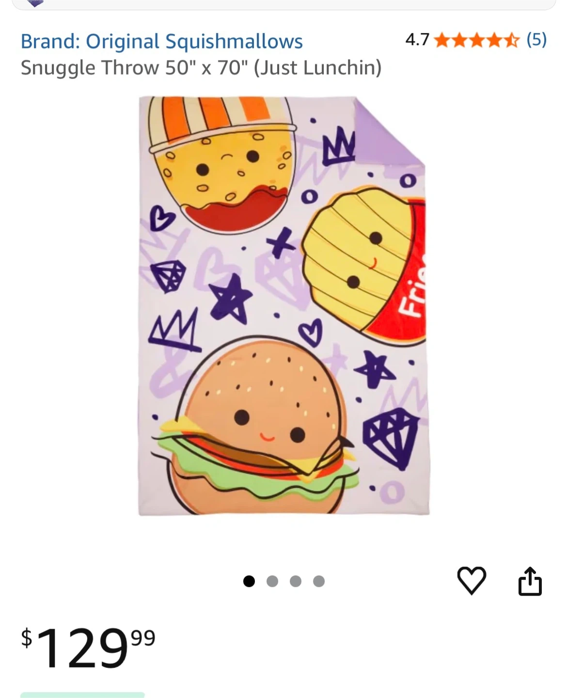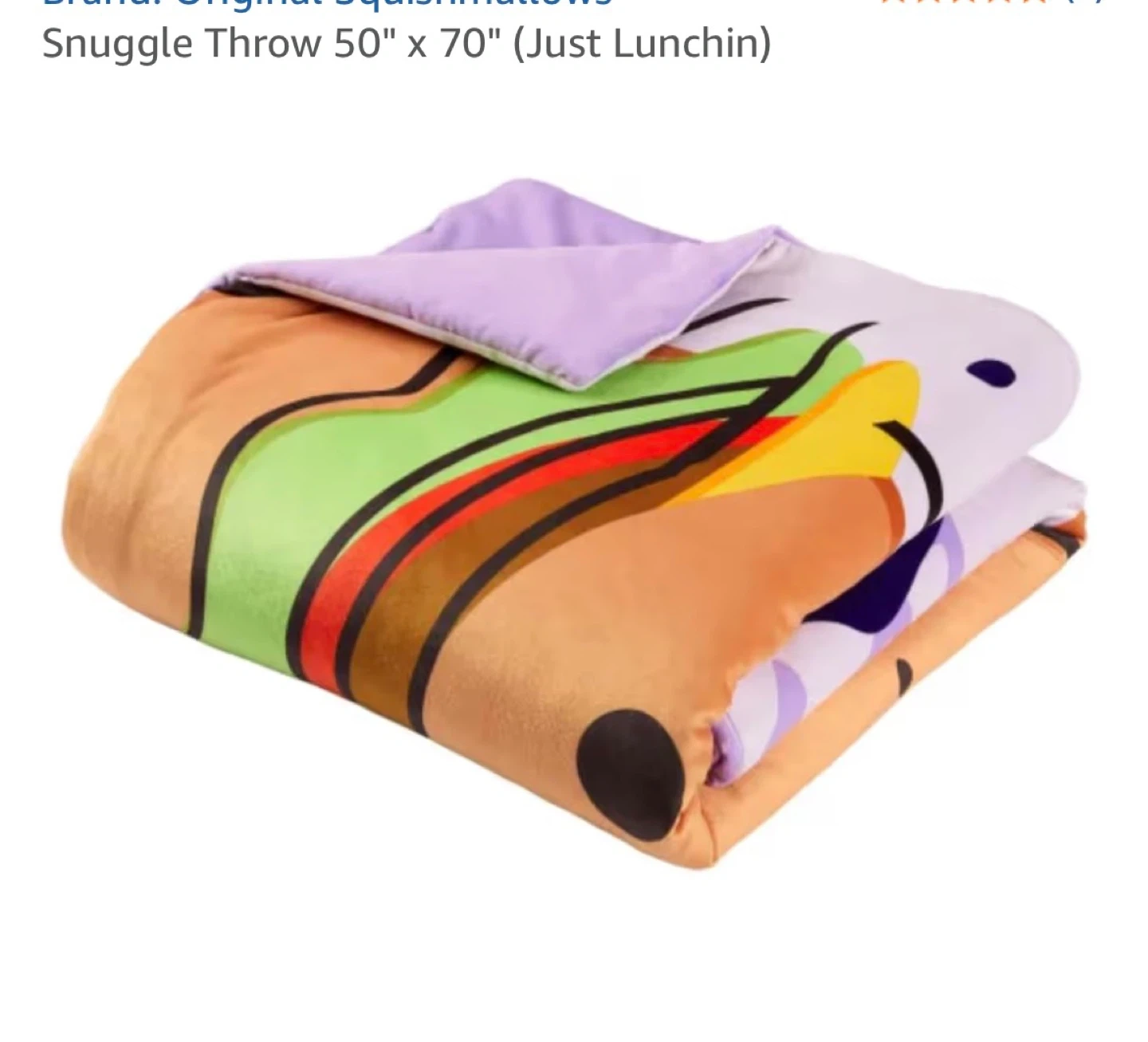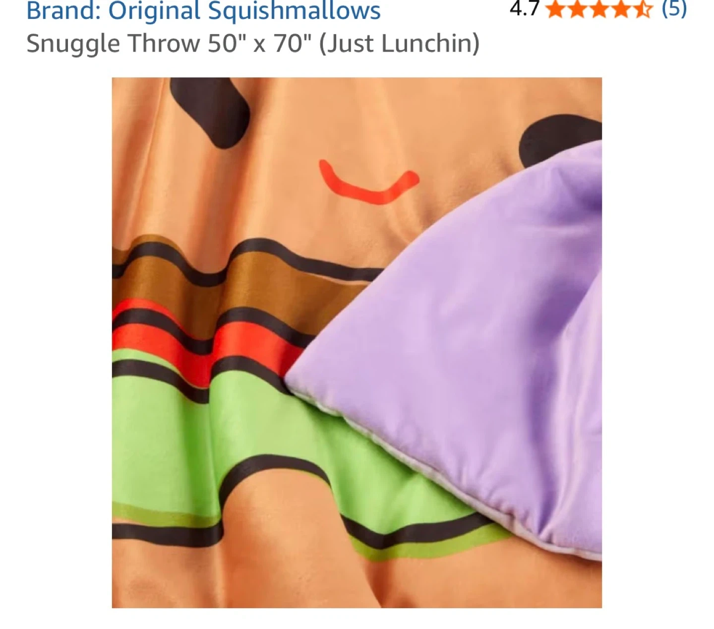 This Original Squishmallows snuggle throw features a fun "Just Lunchin" food theme with burgers and fries. It's made from 95% polyester and 5% filling. The blanket measures 50" by 70". This throw is great for adding some extra comfort and fun to any room!
