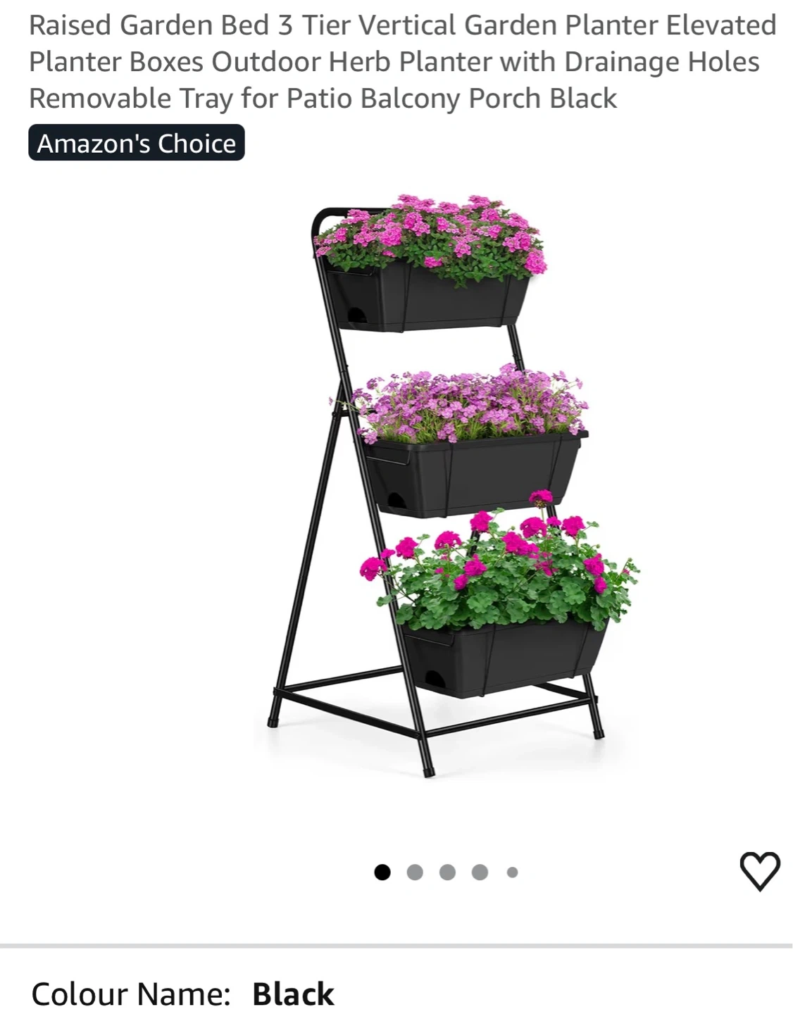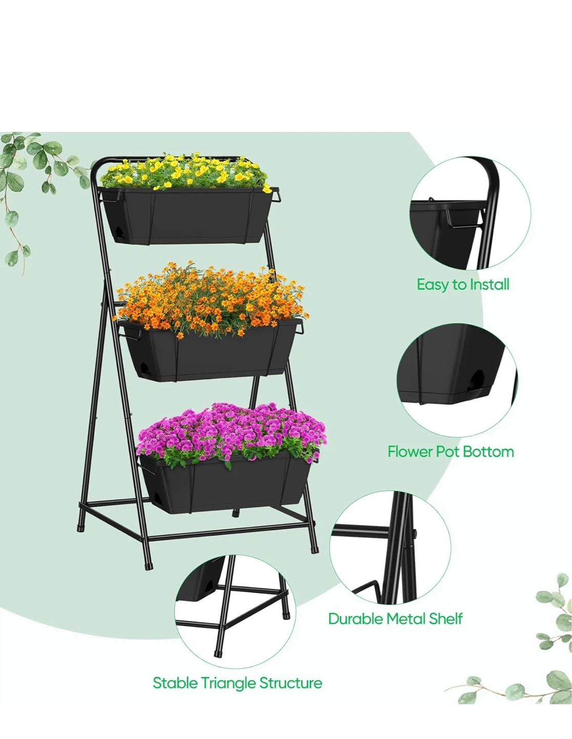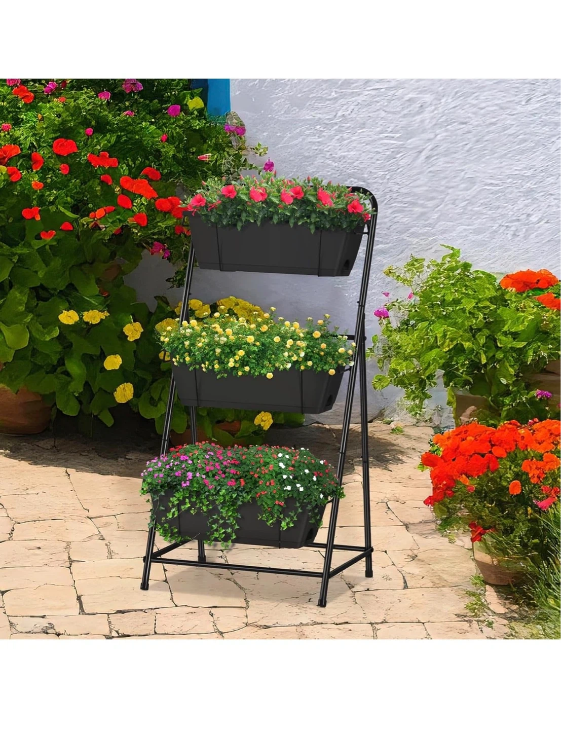 This black 3-tier vertical garden planter features three removable trays with drainage holes. Its durable metal shelf has a stable triangle structure for added support. Overall dimensions are 38 inches tall and 17.7 inches wide.