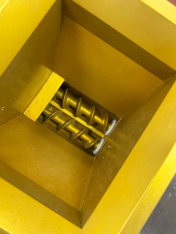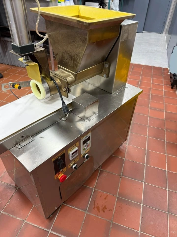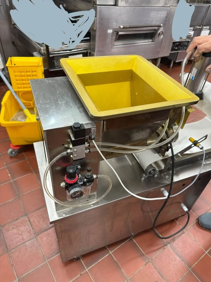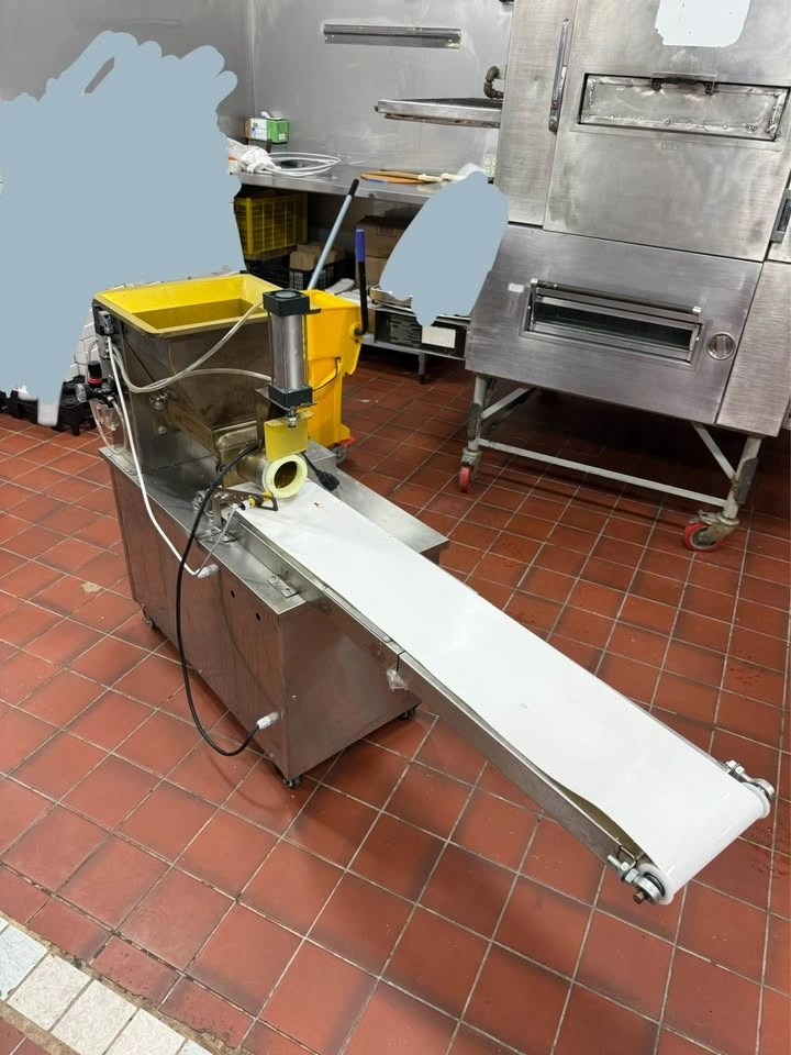 Heavy-duty commercial dough sheeter machine. Stainless steel body with a yellow hopper on top. Has a conveyor belt for easy processing. Controls for conveyor speed, chronometer, and supply switch. Good for a busy kitchen. It comes with a compressor. I bought it originally for pizzas but it’s too small for our volume, it would work amazing in a bakery or for smaller things.