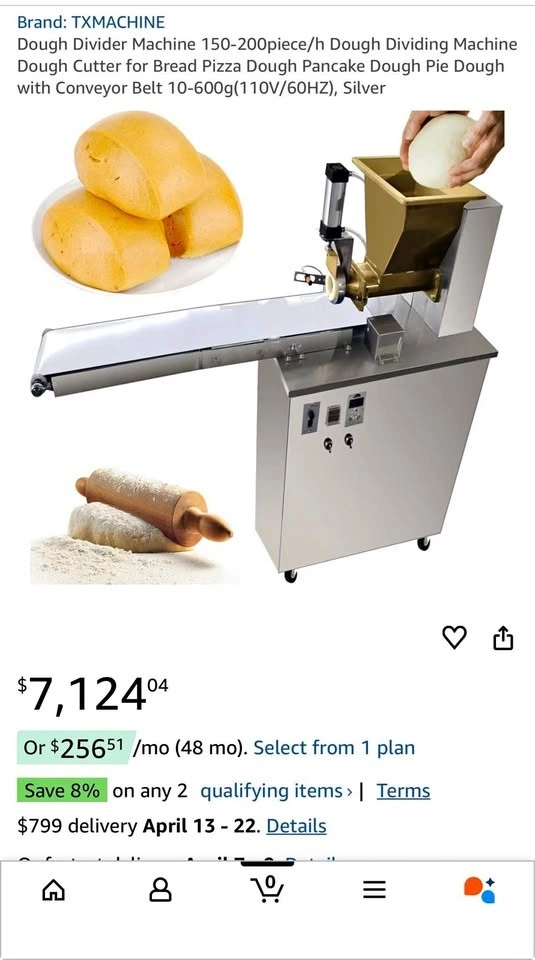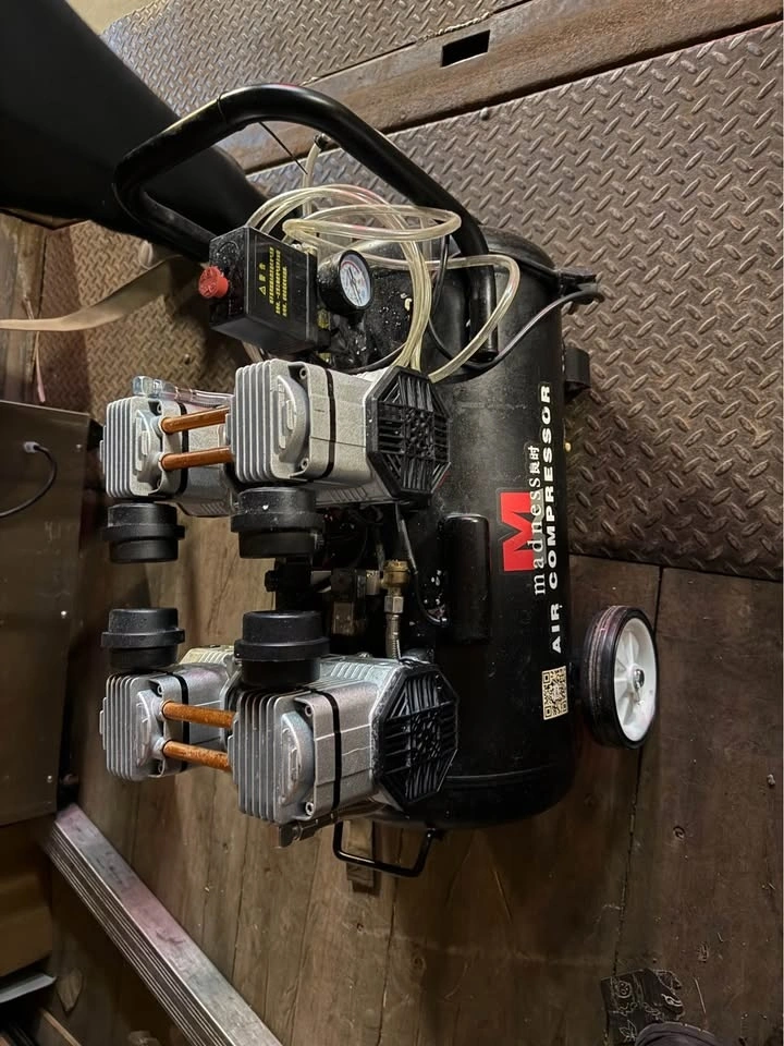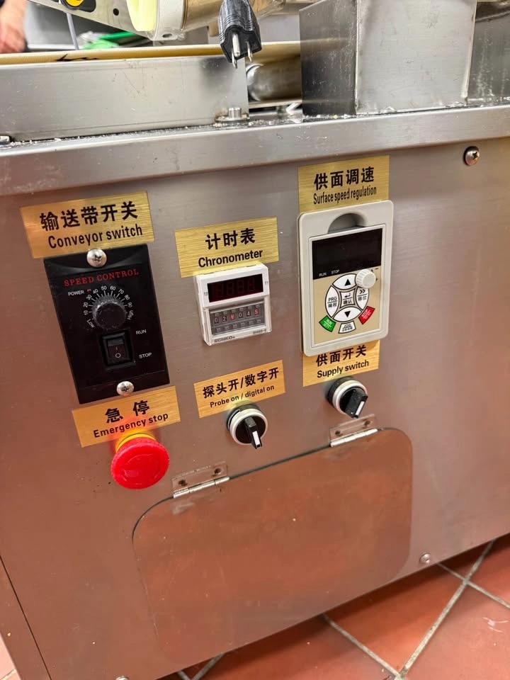 Heavy-duty commercial dough sheeter machine. Stainless steel body with a yellow hopper on top. Has a conveyor belt for easy processing. Controls for conveyor speed, chronometer, and supply switch. Good for a busy kitchen. It comes with a compressor. I bought it originally for pizzas but it’s too small for our volume, it would work amazing in a bakery or for smaller things.