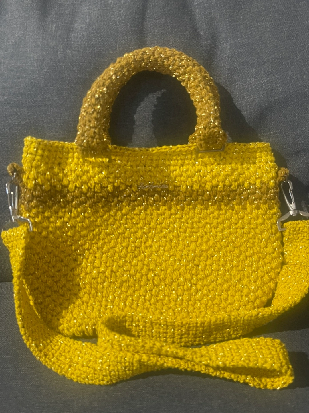 Adorable mustard yellow crocheted handbag. Features a top handle and a long shoulder strap. Medium size, perfect for everyday use.