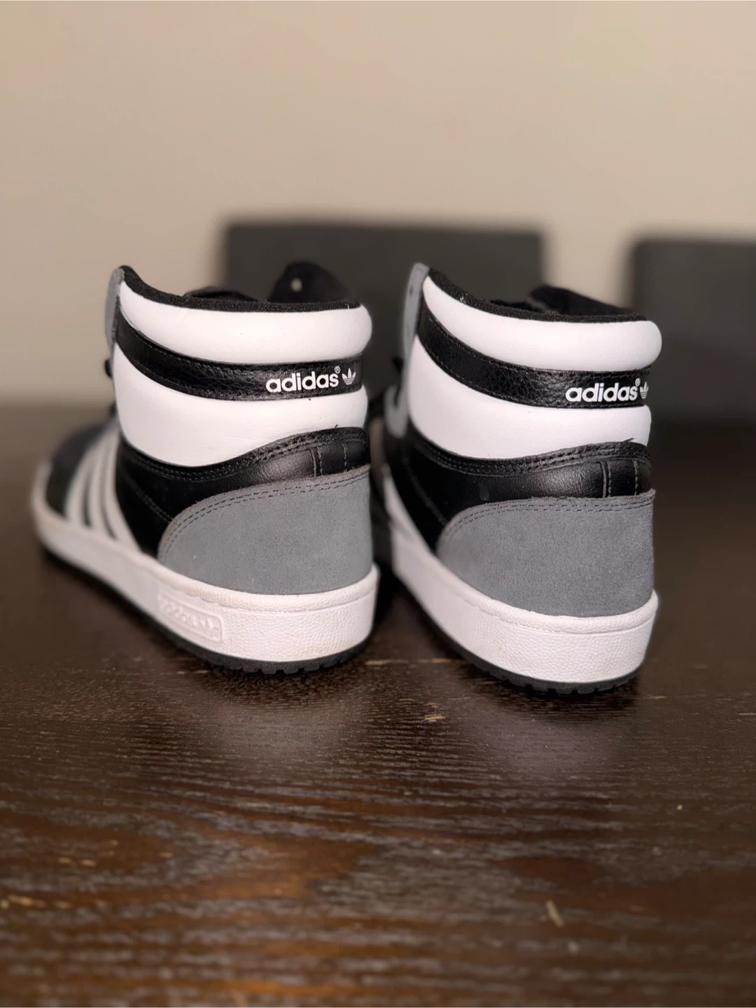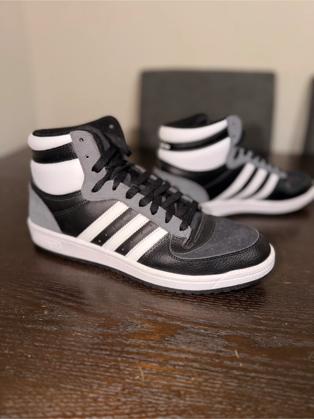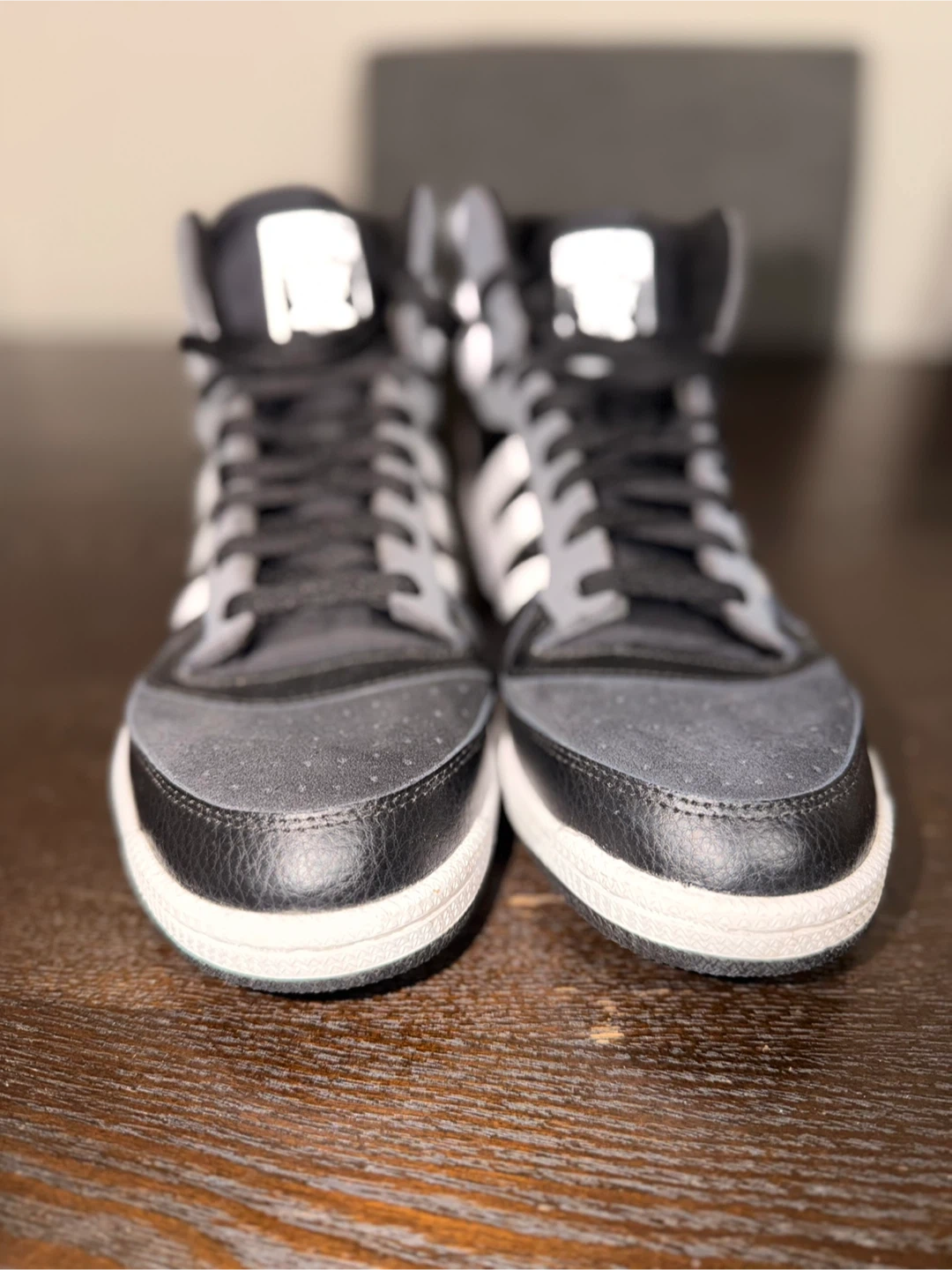 Selling a pair of Adidas Top Ten Hi sneakers in black and grey! These high-tops have the classic Adidas stripes and a cool retro vibe. They show some signs of wear but still have plenty of life left in them