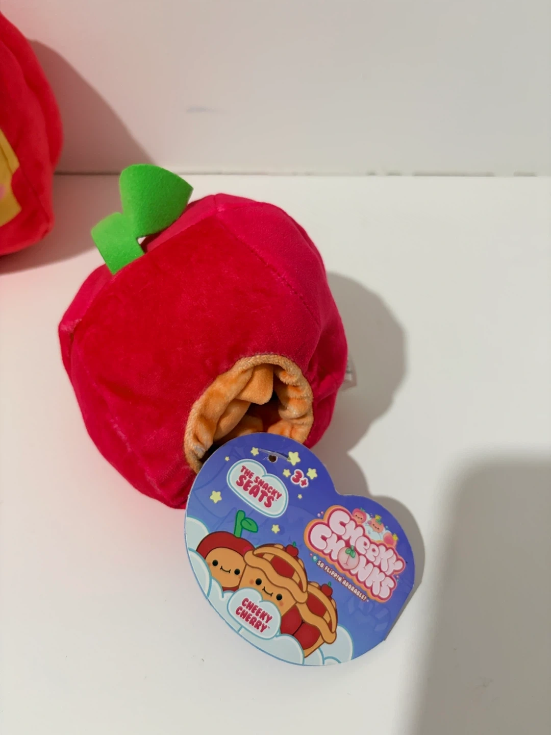 This is a Cheeky Chonks Cheeky Cherry plush toy. It's a soft, red apple-shaped plush with green leaves. Suitable for ages 3 and up.