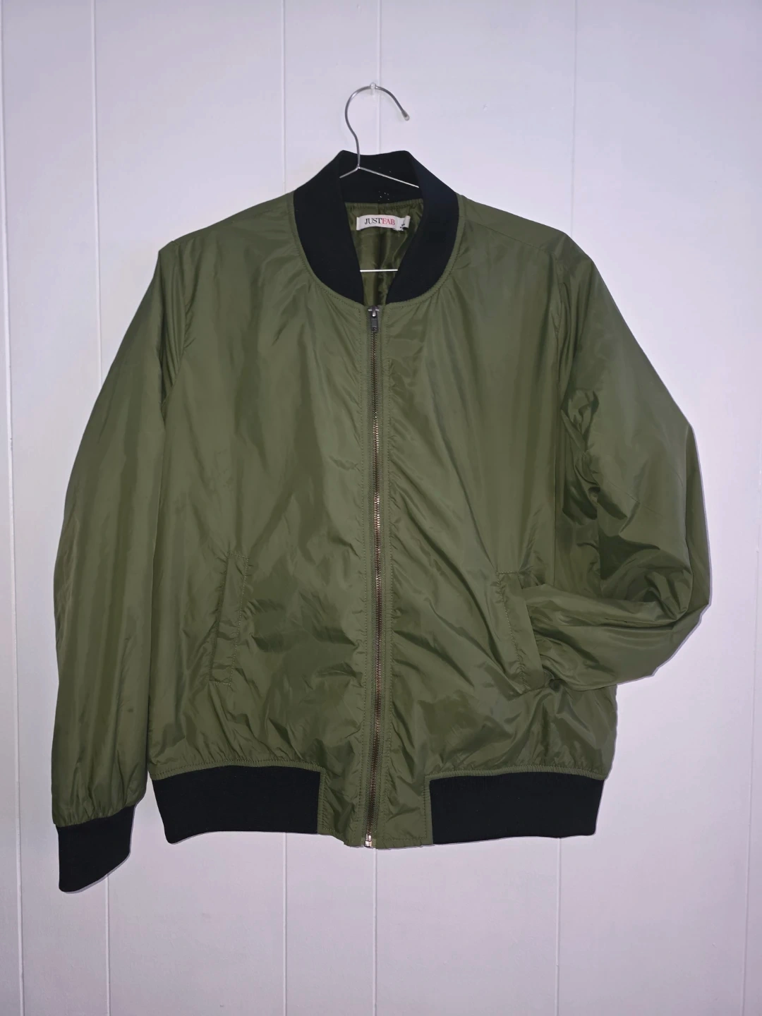 Selling a JustFab bomber jacket in olive green! It's a stylish and lightweight jacket, perfect for layering. The jacket features a zip-up front and ribbed cuffs and hem.