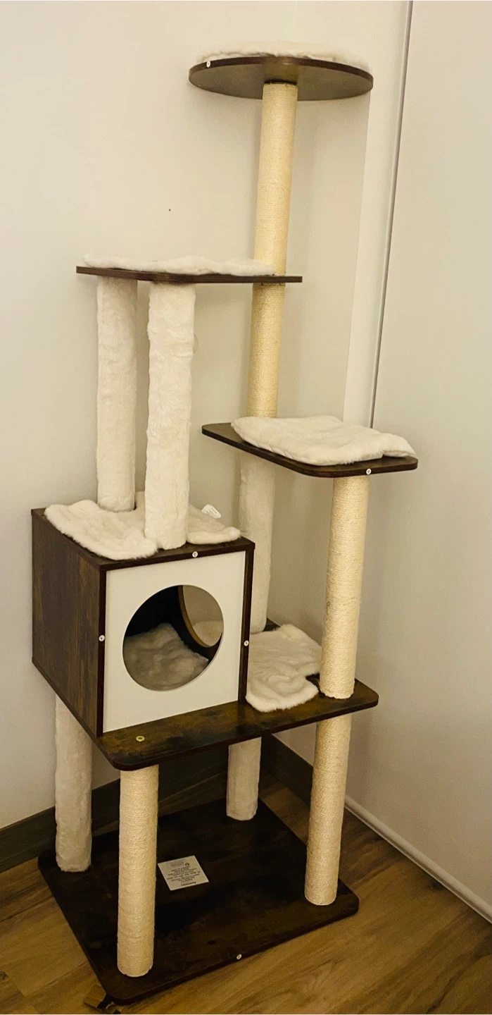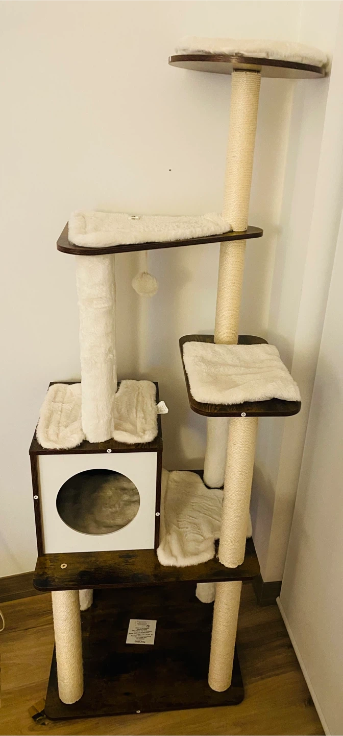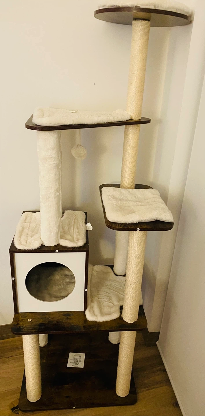 This multi-level cat tree features soft plush perches and scratching posts wrapped in sisal rope. It includes a cozy condo for your cat to rest and play. Perfect for households with multiple cats!