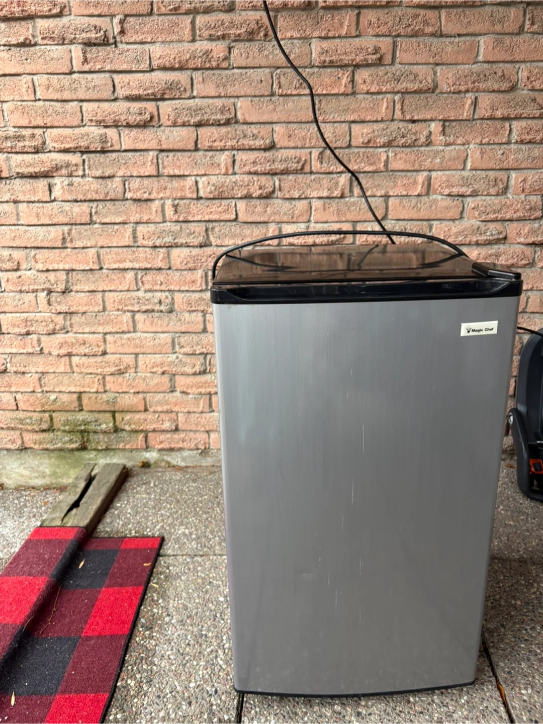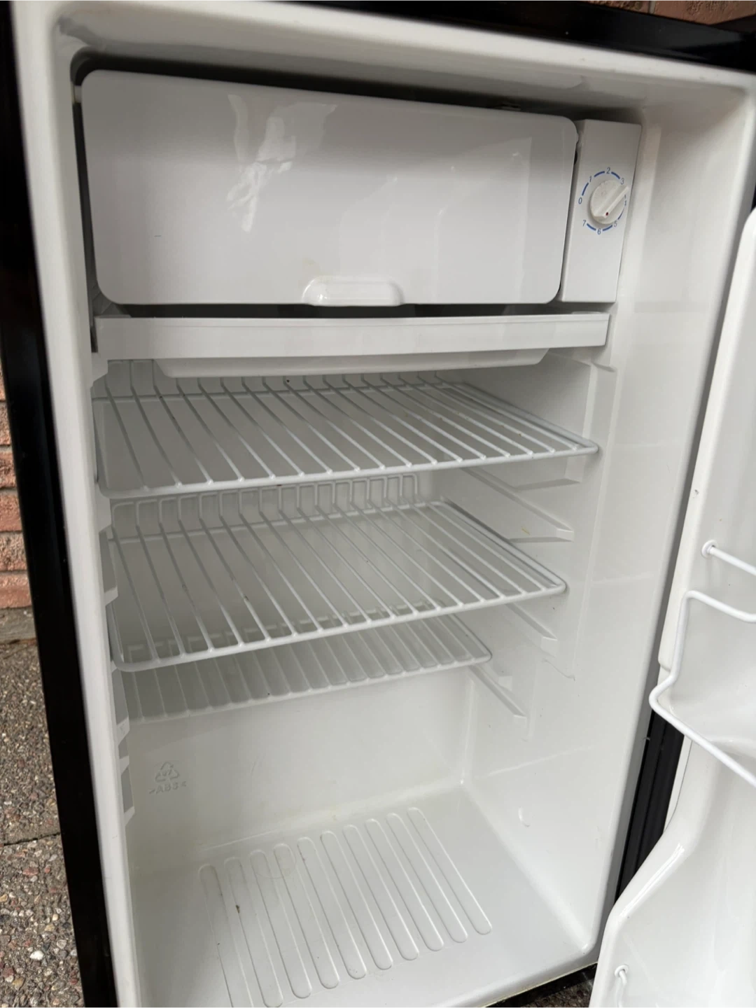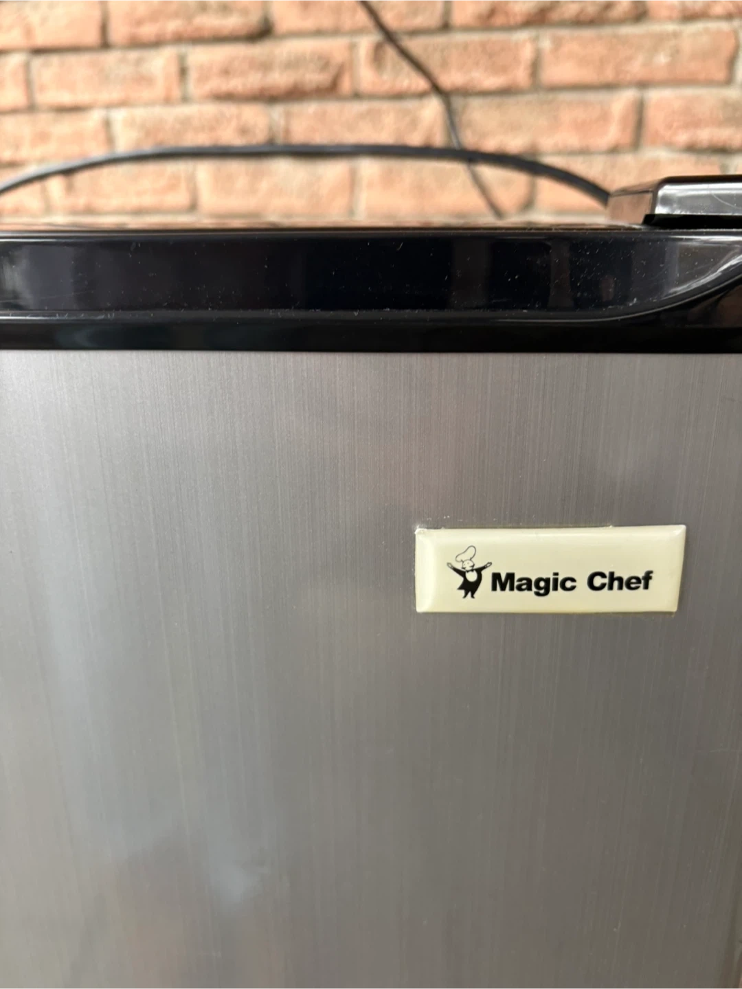 Magic Chef mini fridge. Silver and black exterior. Interior features wire shelves and door bins. Perfect for dorm rooms or small spaces!