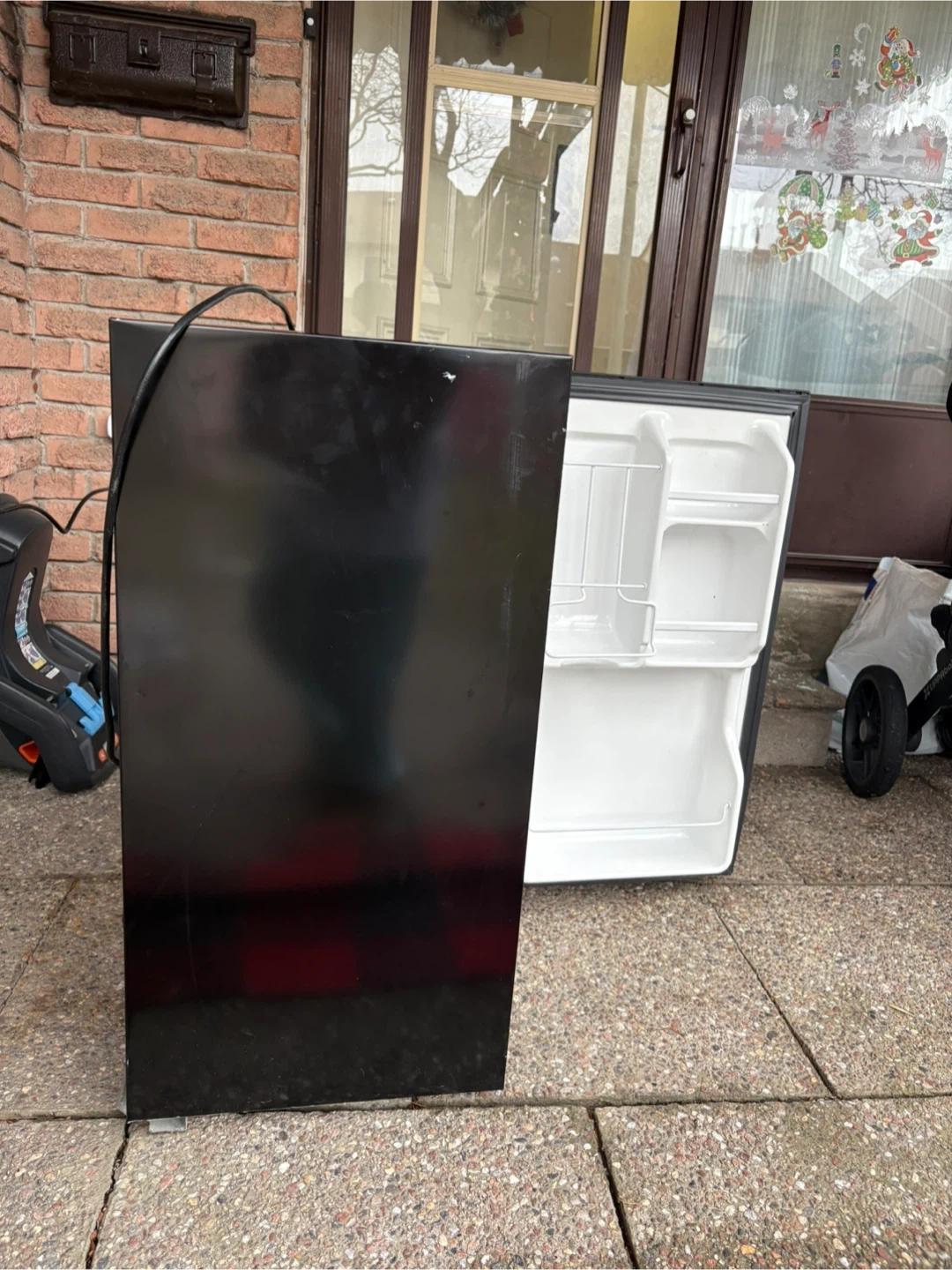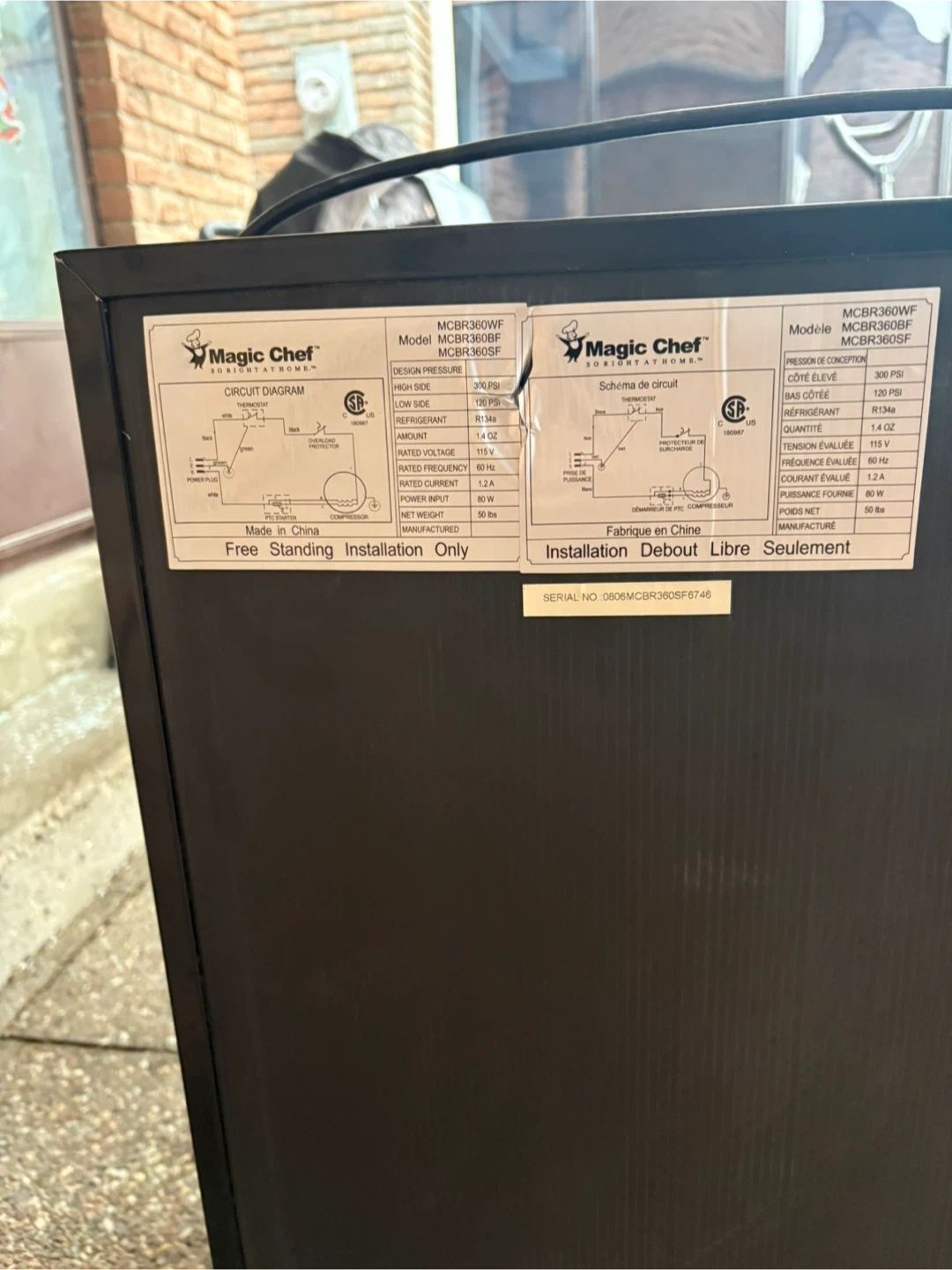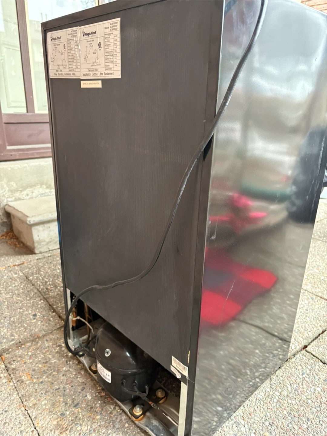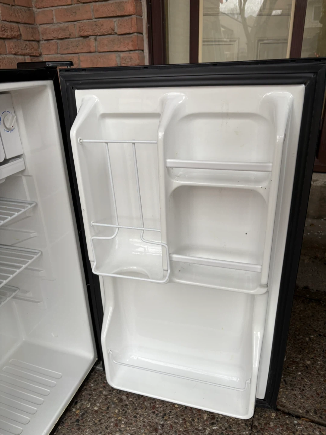 Magic Chef mini fridge. Silver and black exterior. Interior features wire shelves and door bins. Perfect for dorm rooms or small spaces!