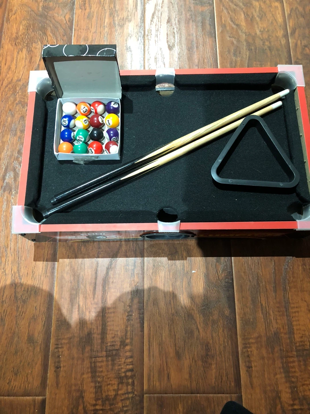 This is a compact tabletop pool game. It comes with a set of pool balls and two cues. A rack for the balls is also included. Great for quick games anywhere!