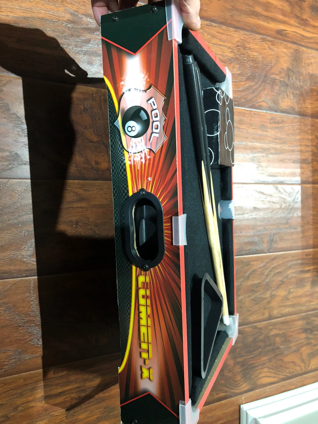 This is a compact tabletop pool game. It comes with a set of pool balls and two cues. A rack for the balls is also included. Great for quick games anywhere!