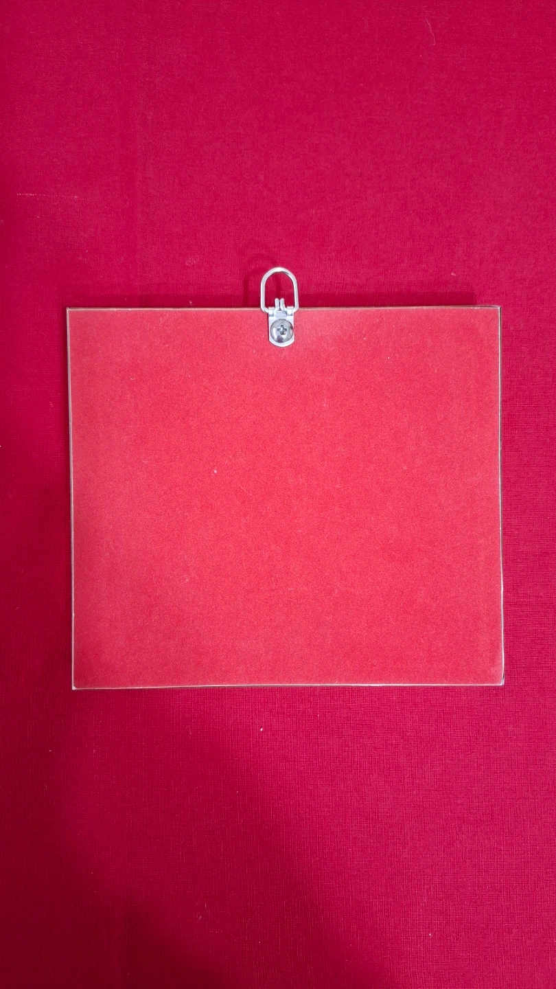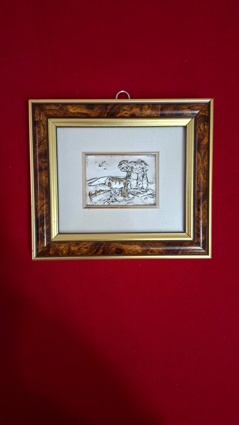 This is a framed art piece featuring a landscape scene. It has a '925' stamp indicating sterling silver content. The frame is made of wood with a burl wood finish. Measures 6x7 inches.