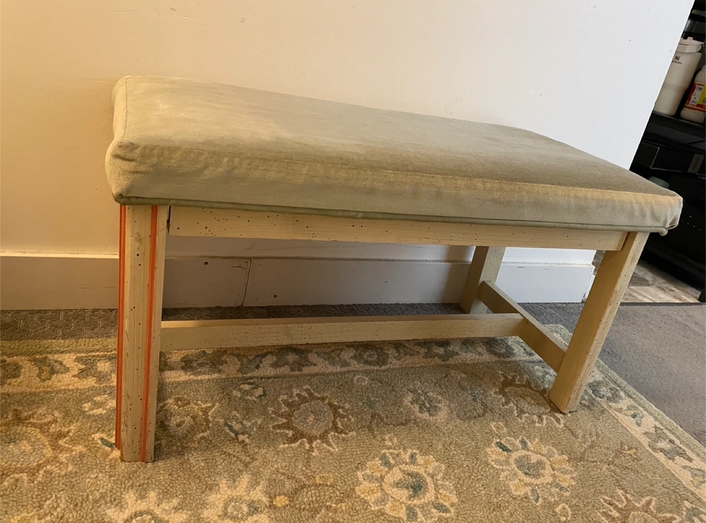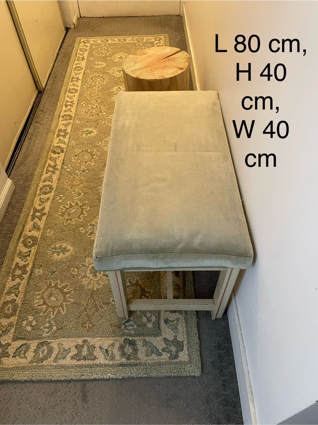 This upholstered bench offers comfortable seating. It's 80 cm long, 40 cm high, and 40 cm wide. The light green upholstery is soft to the touch. Great for an entryway or at the foot of a bed!