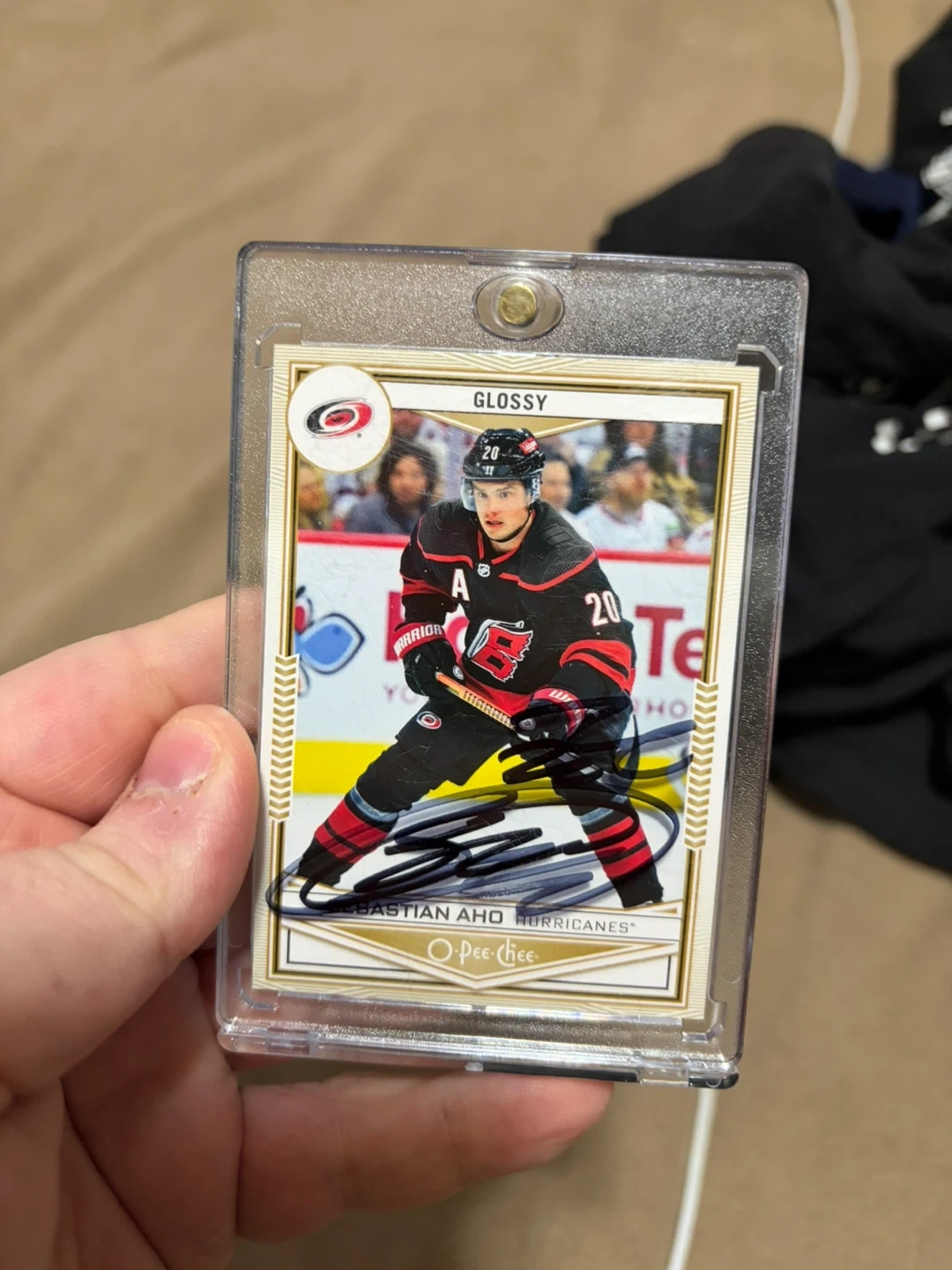 Sebastian Aho signed "Glossy" hockey card from O-Pee-Chee. Features the Carolina Hurricanes player. Card is protected in a clear case.